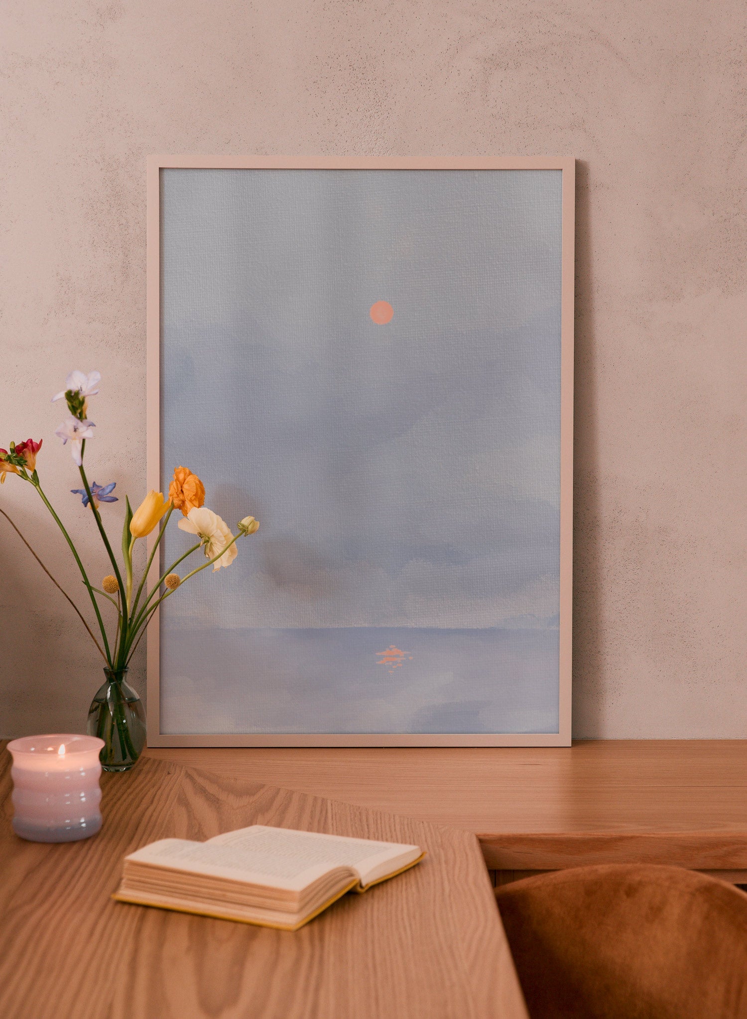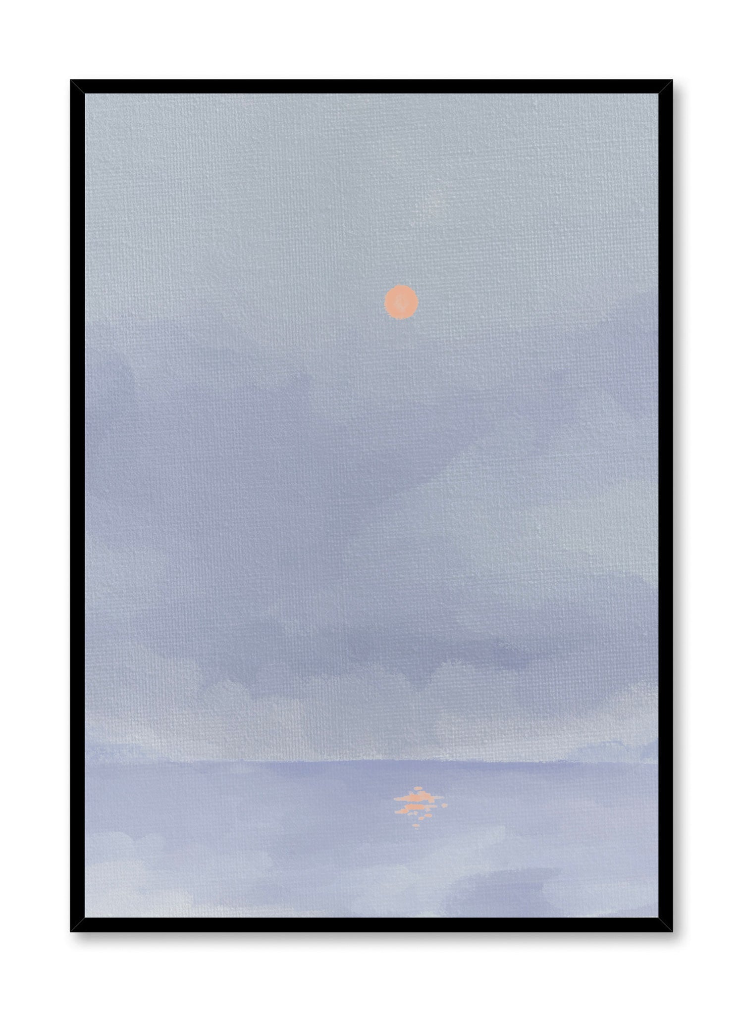 In our fast-paced world, it's vital to take a moment to appreciate the serenity of silence. This Zen watercolor features an orange sun setting behind a serene blue lake on a misty evening.