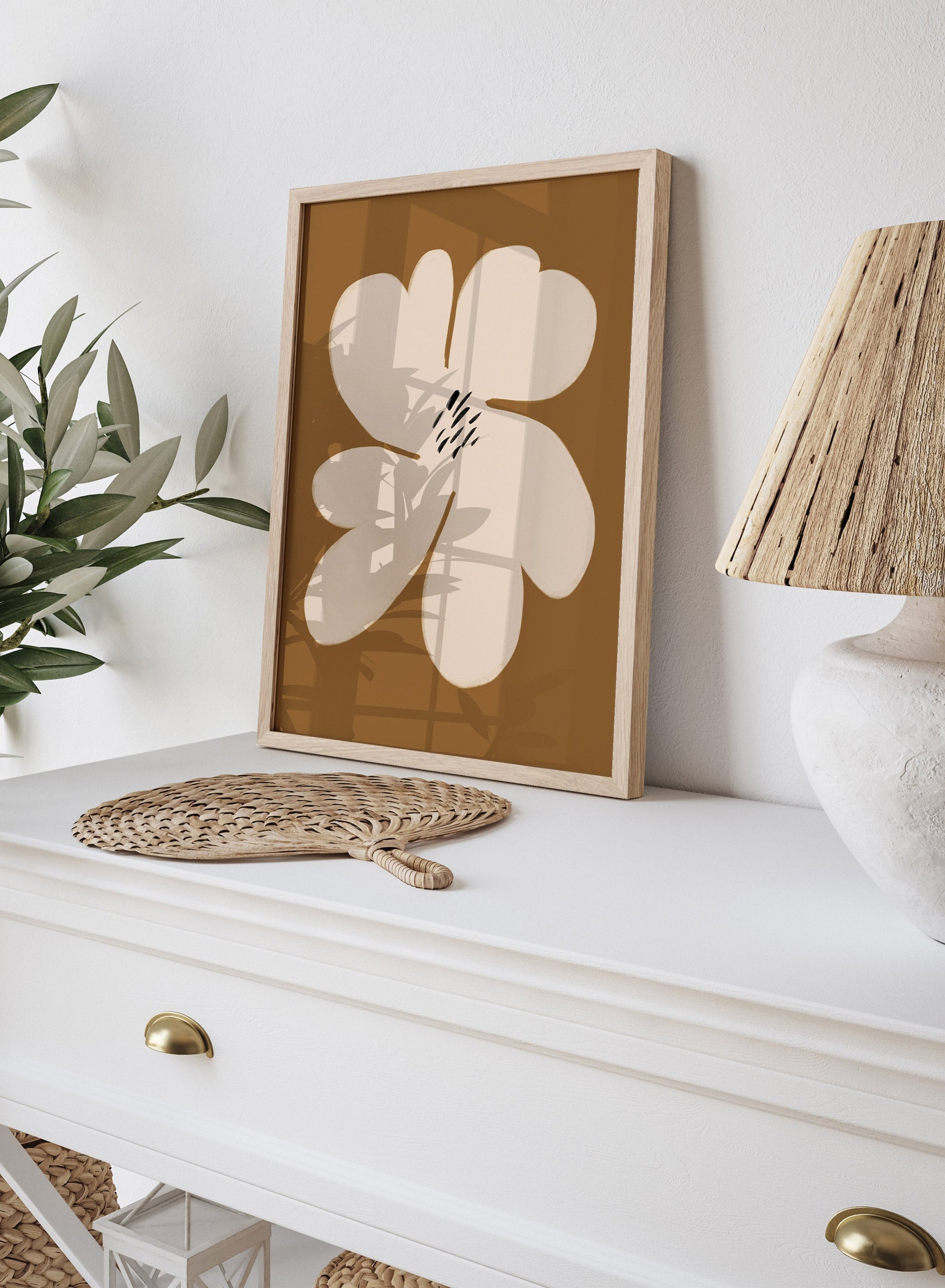 Attention all lovers of abstract floral art! The 'Flora' poster showcases a stunning beige flower featuring minimalist black stamens set against a rich brown backdrop. Take advantage of the color scheme of this print to infuse your walls with warmth and sophistication.