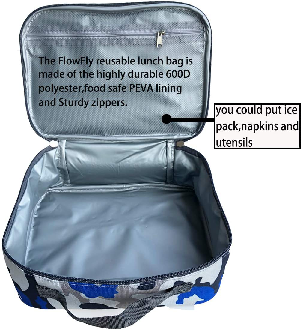 - ✿ Material: The FlowFly reusable lunch box is constructed with durable 600D Polyester, food-safe PEVA lining, and sturdy zippers.