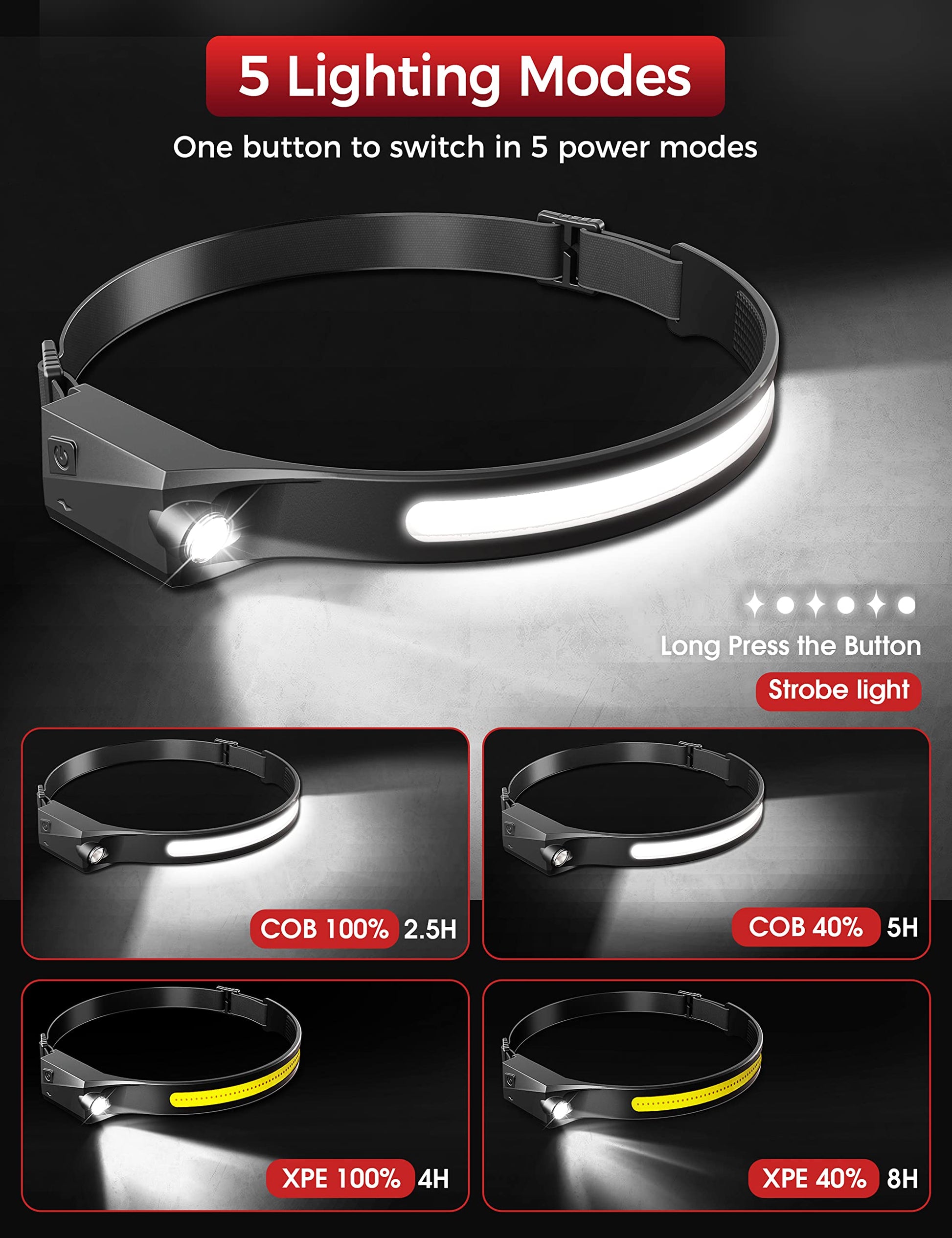 - **Versatile Light Modes**: Equipped with five light settings—COB high, COB low, XPE high, XPE low, and SOS—this headlamp adapts to any situation. Easily switch between modes with short presses, or activate the SOS blinking function for emergencies with a long press.