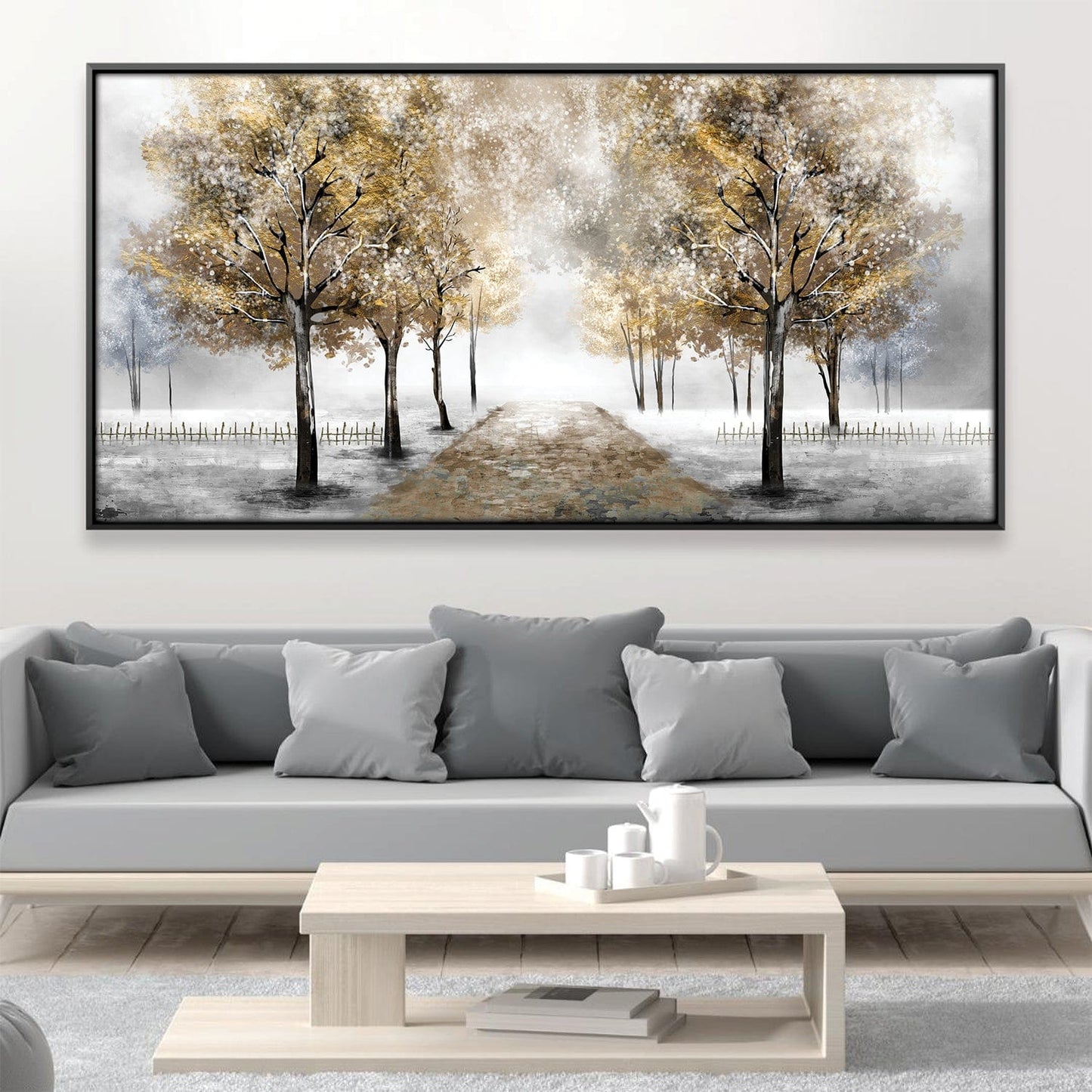 Crafted with exceptional artistry, the "Golden Entry" canvas wall art transforms the concept of sophistication in home decor. This abstract piece, adorned with dazzling golden trees, presents an enchanting pathway that invites exploration. The harmonious blend of gold, white, and gray tones evokes a sense of luxury and tranquility, making it a perfect addition to your living space. Enhance your interior style with this stunning wall image, available as a canvas print or framed artwork, and immerse yourself in the allure of artistic beauty.