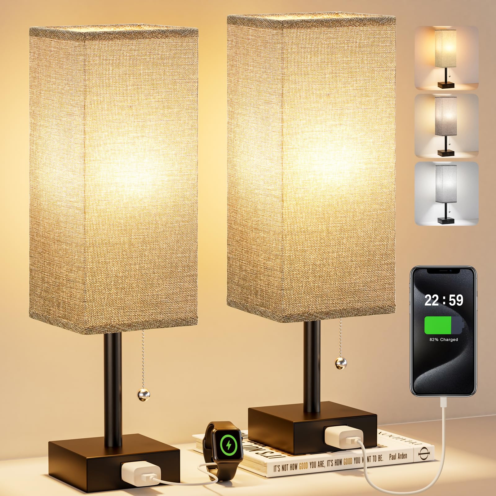 Rynx | Gray Bedside Lamps For Bedroom Set Of 2 - Small Rectangular Nightstand Lamp With AC Outlet Charger, 3 Color Temperatures D