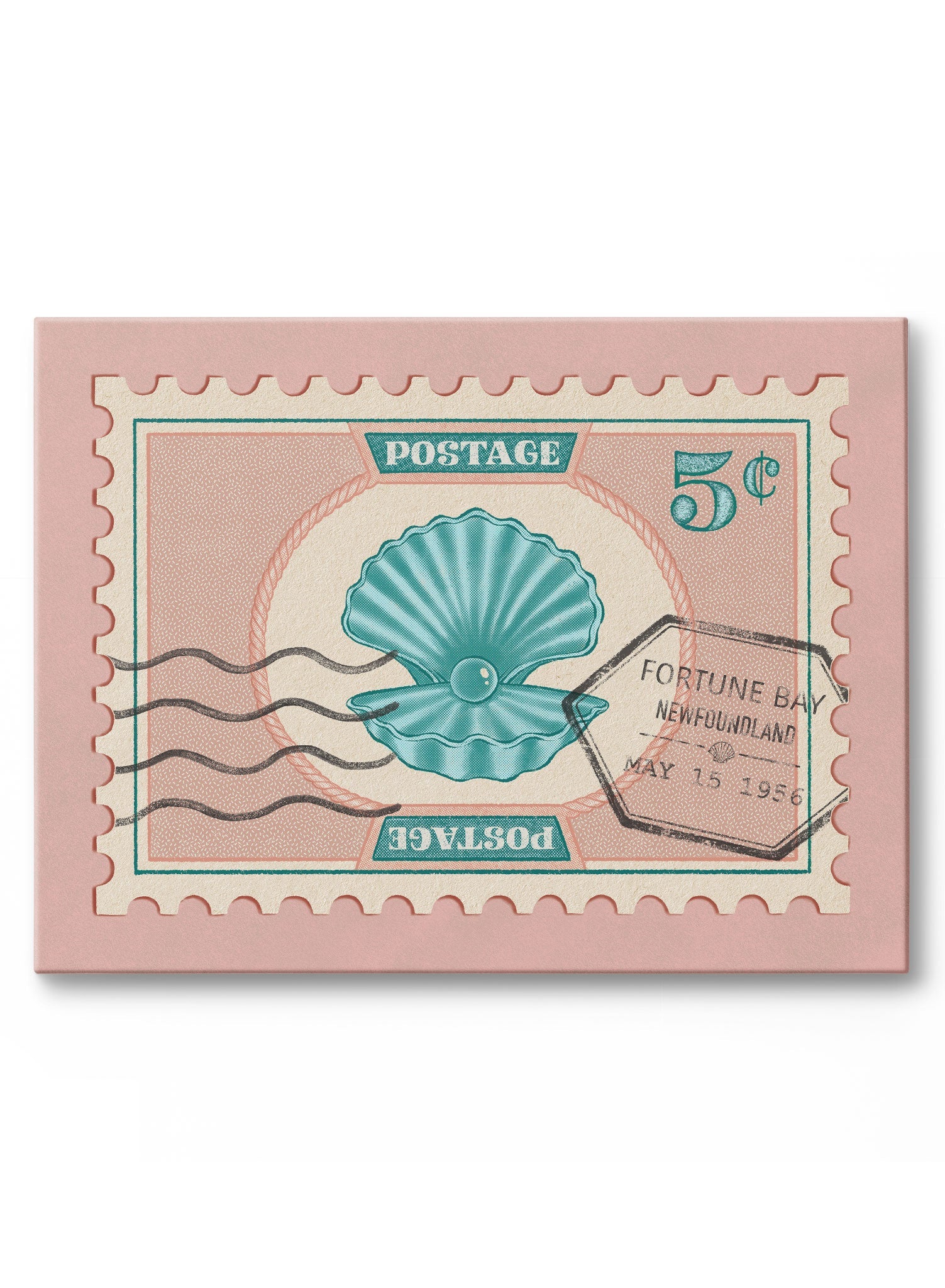 A stamp that celebrates the most beautiful summer in Maine! This pink vintage stamp illustration depicts a teal shell and highlights the area of Maine in the United States.