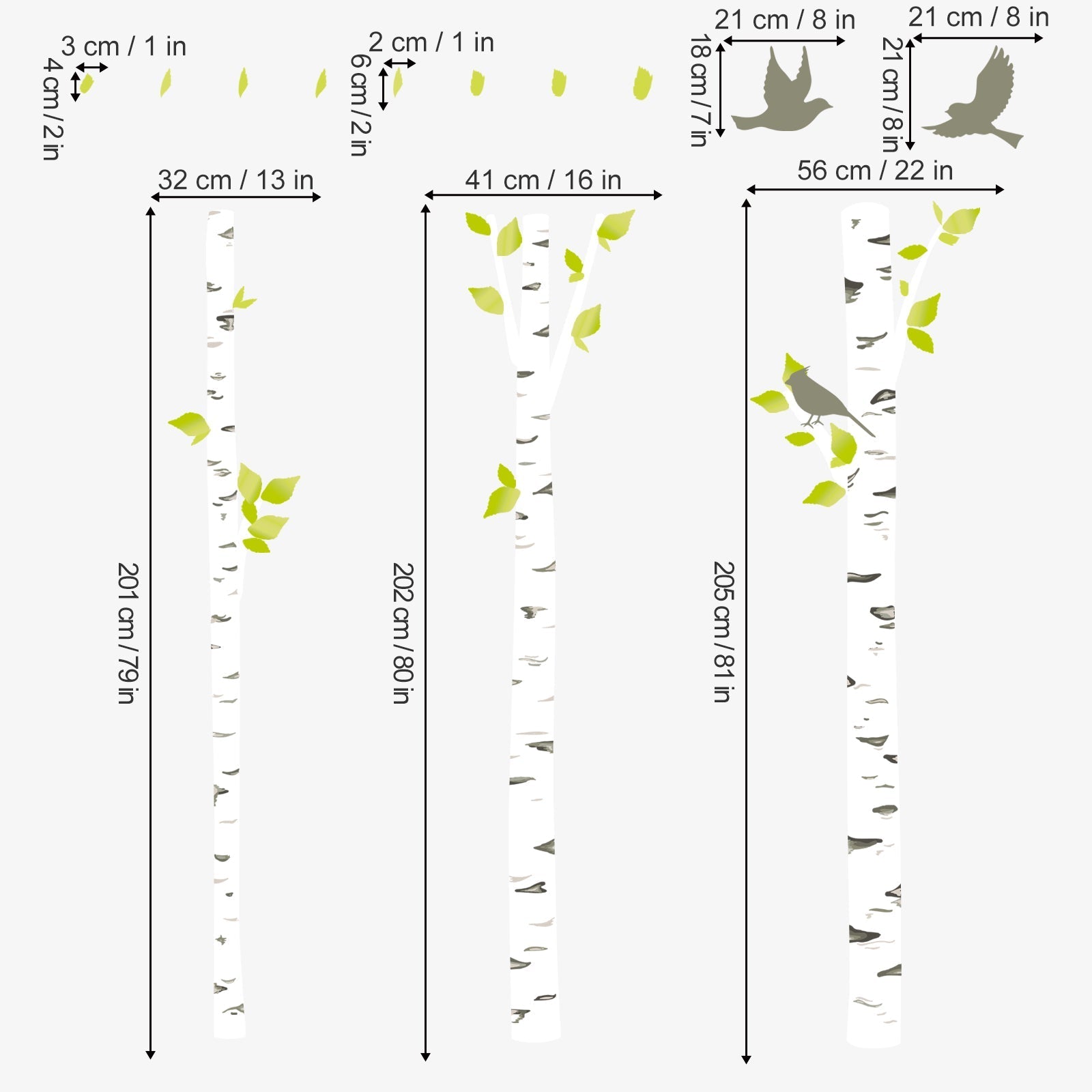 This wall sticker set provides a beautiful enhancement for your bedroom, showcasing a group of three birch trees, a bird, and leaves. It creates a cozy forest atmosphere in your room.