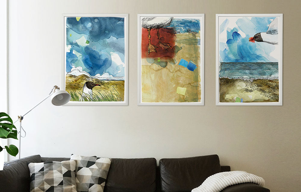 Poster featuring a seagull. Graphic design. Ink, watercolor, and gouache painting.