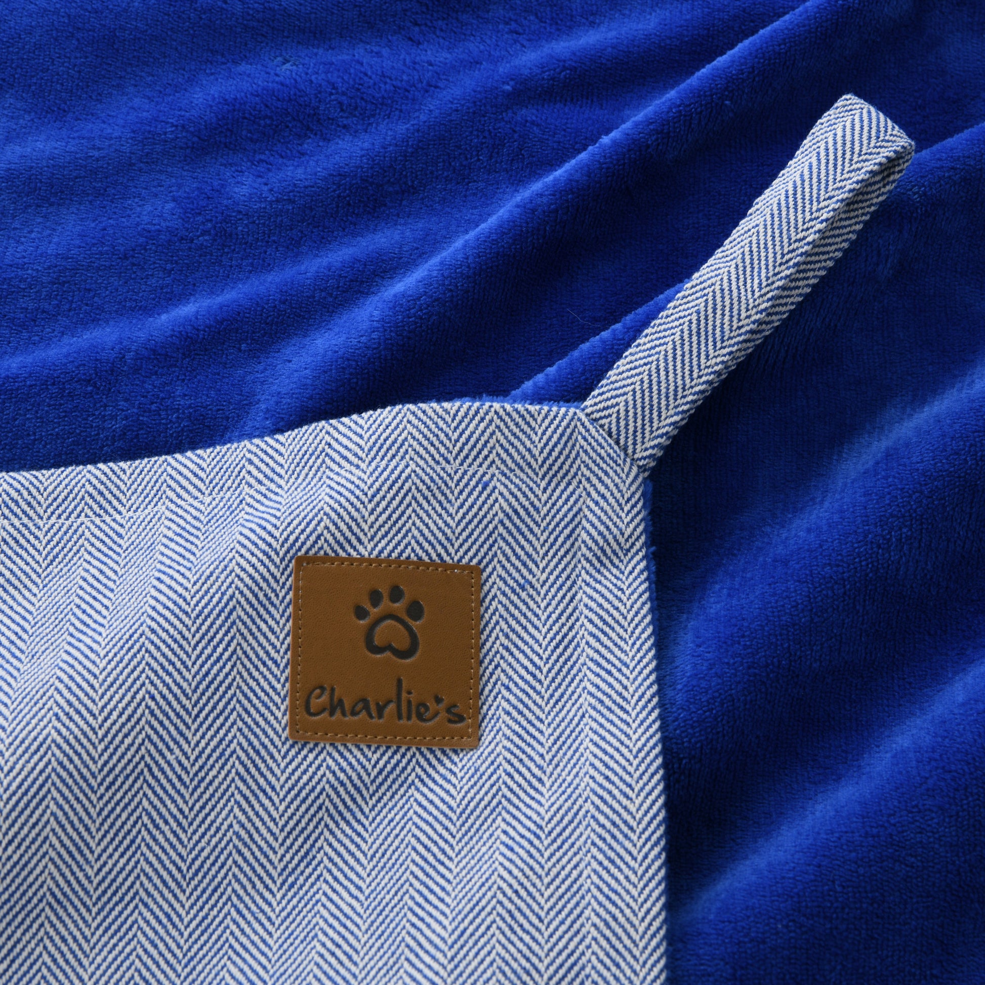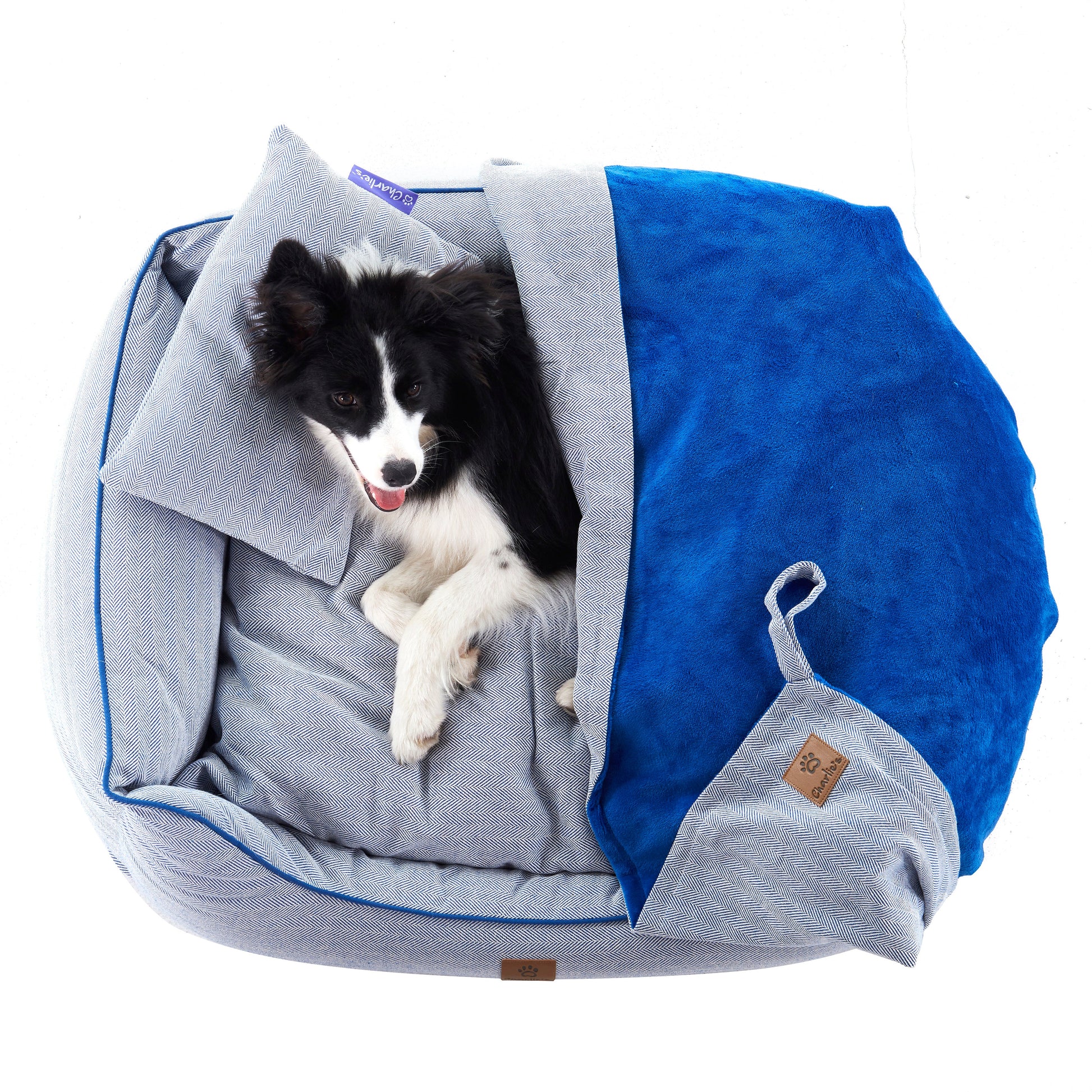 Available in small, medium, and large sizes, this chic dog bed set accommodates pups of all shapes and sizes, and the elegant blue and white herringbone pattern will have your furry friend looking and feeling fabulous.