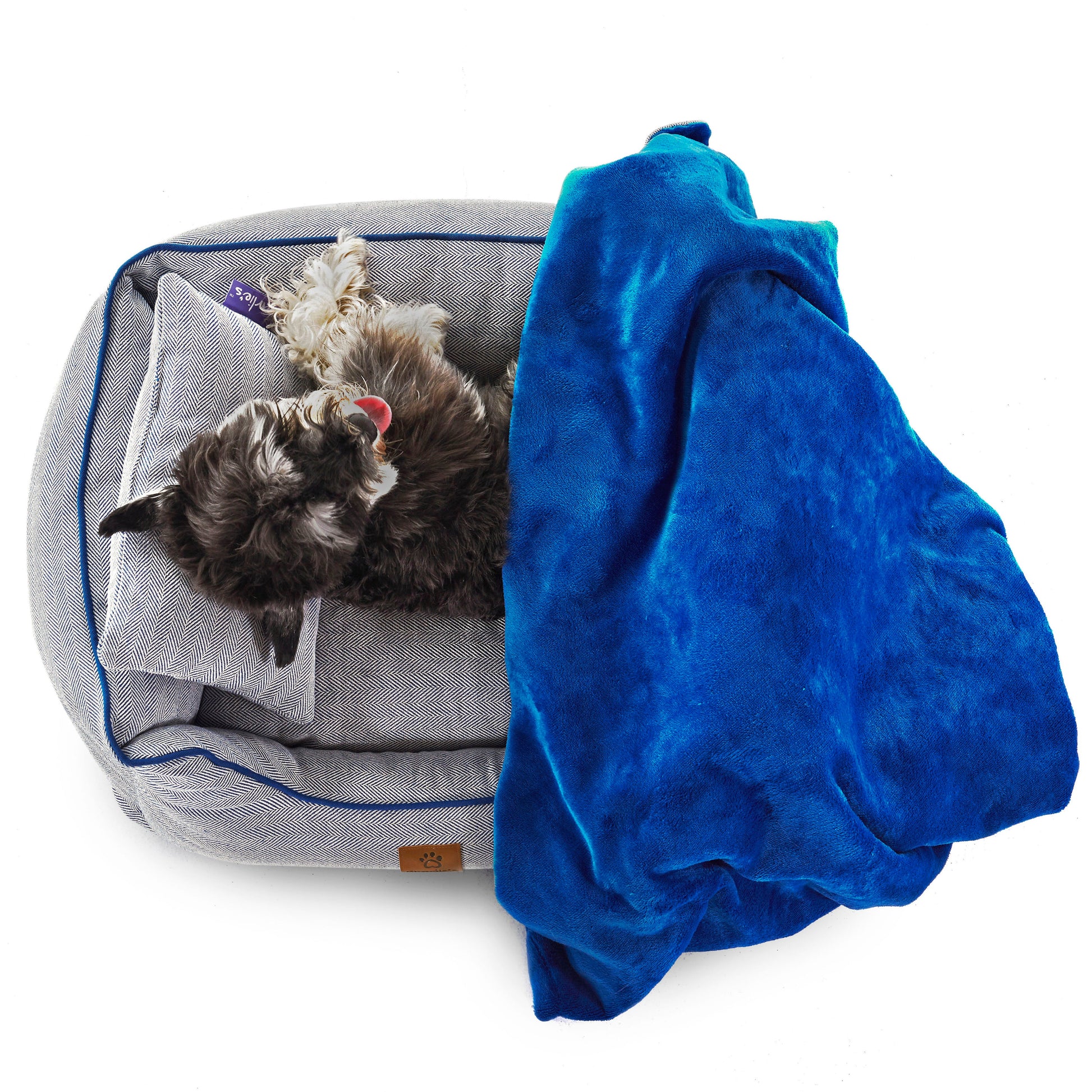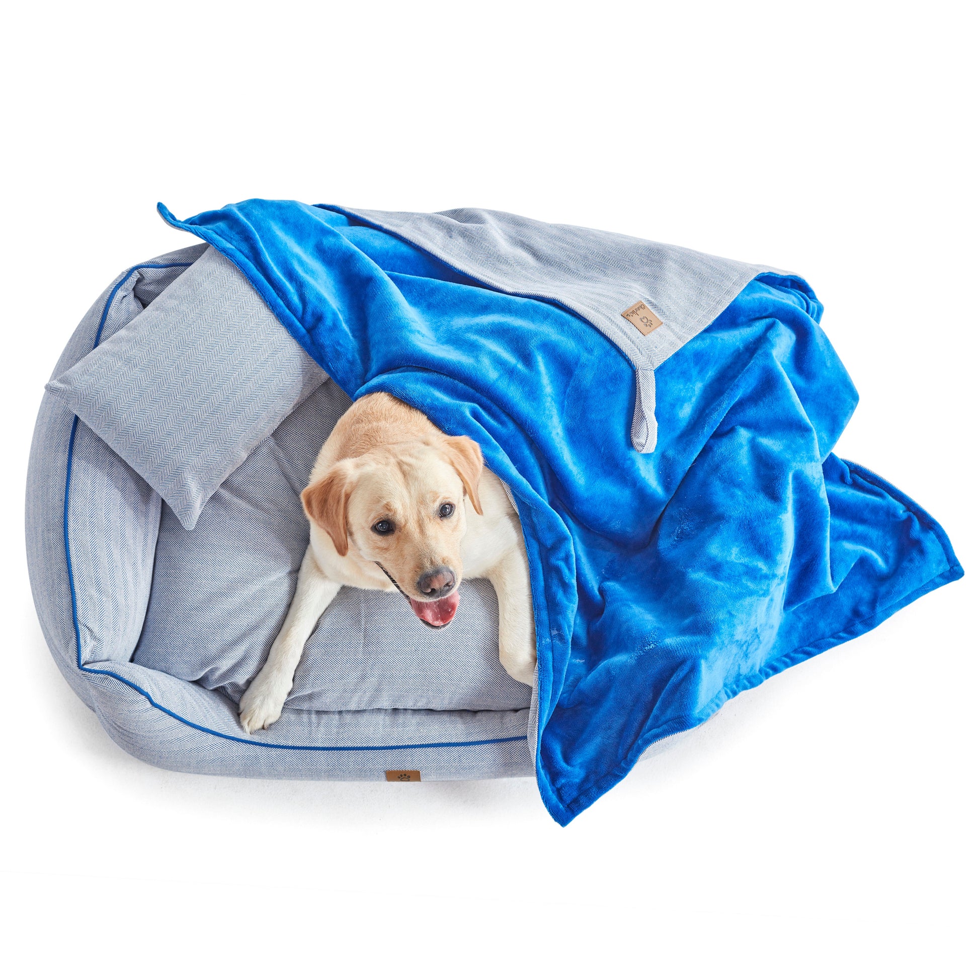Sweet dreams of beach runs and frisbee fun are always just around the corner, thanks to a plush cushion for extra head support and a cozy double-sided blanket that can also serve as a throw or sofa protector. The upper layer features matching twill, while the soft plush bottom is crafted from coral fleece, the same material often found in human beds!