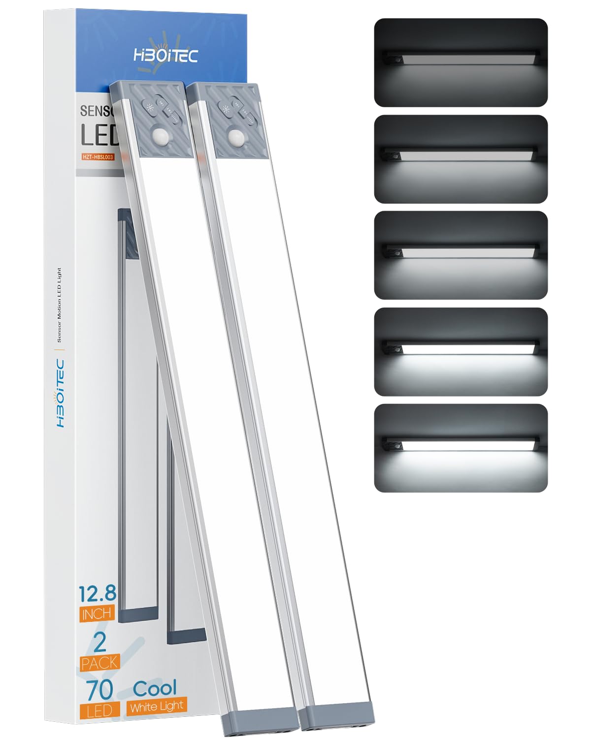 Rynx | Hiboitec Under Cabinet Lighting Rechargeable Closet Light Wireless Motion Sensor Light Indoor, 70 LED Dimmable Magnetic Light Under Counter Light For Kitchen, 2 Pack, Cool White Light, 12.8 Inches