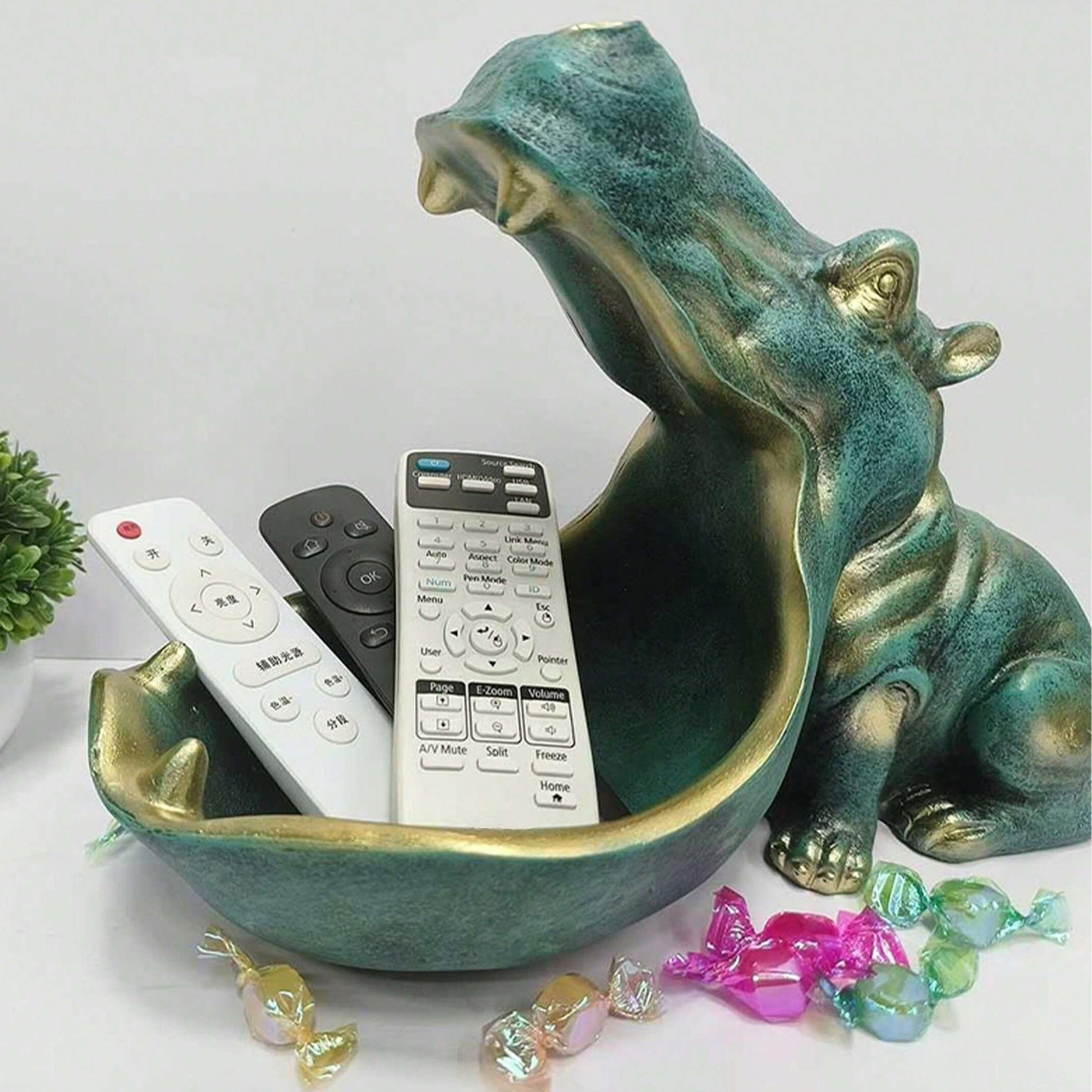 The HippoServe - Rhinoceros Figure with Candy Bowl is a distinctive and versatile decorative sculpture ideal for both indoor and outdoor settings. This delightful rhino bowl is perfect for holding candy, keys, or other small items, and it fits seamlessly in various spaces like the hallway, living room, or office. Its sturdy build makes it a fun and functional decorative piece in any area.