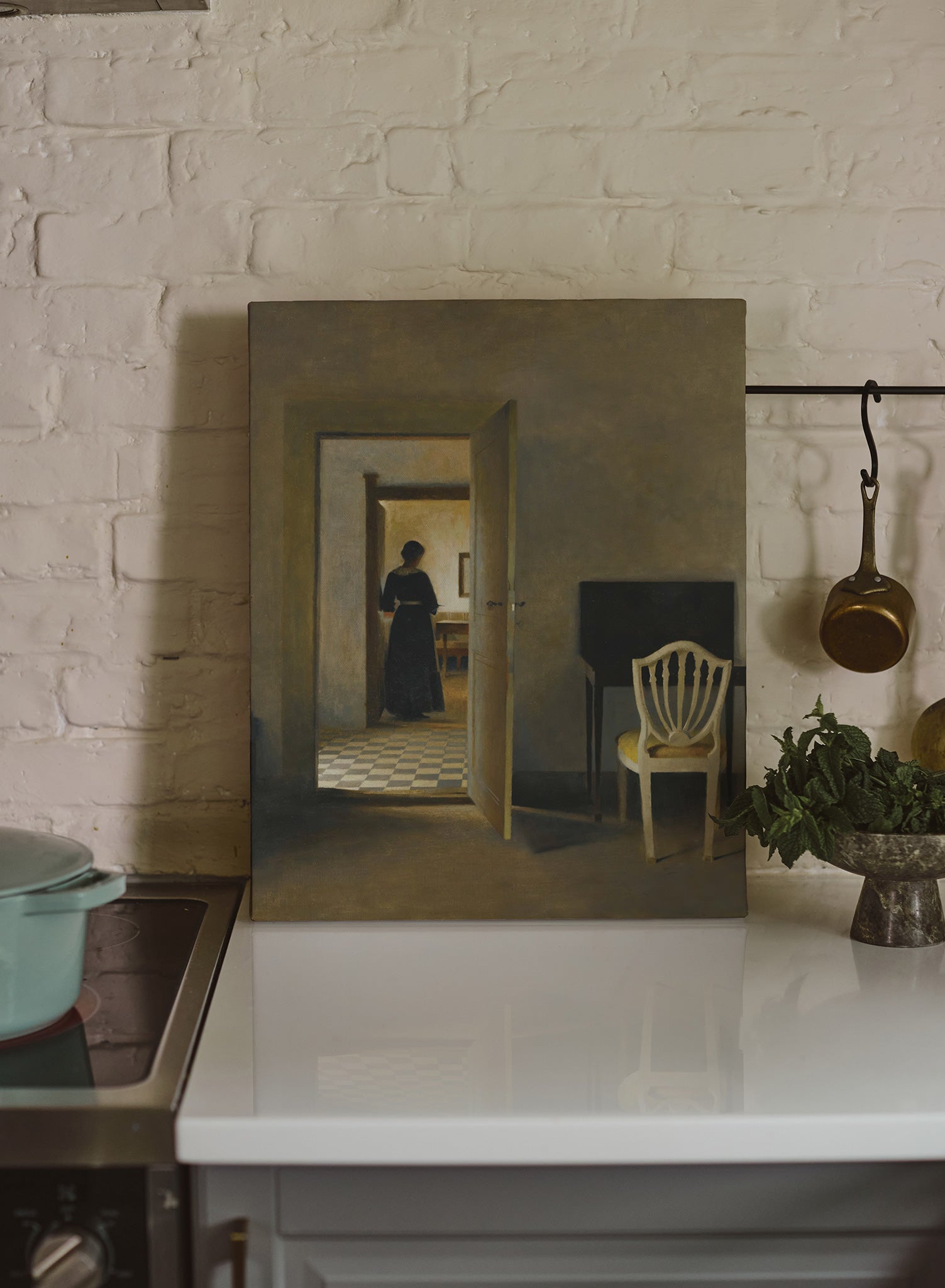 This captivating interior scene captures a fleeting moment, as if the viewer has stumbled upon a quiet narrative within a private space. The composition draws the eye through an open doorway to a woman standing in the adjoining room, her back turned as she engages in a subtle task.