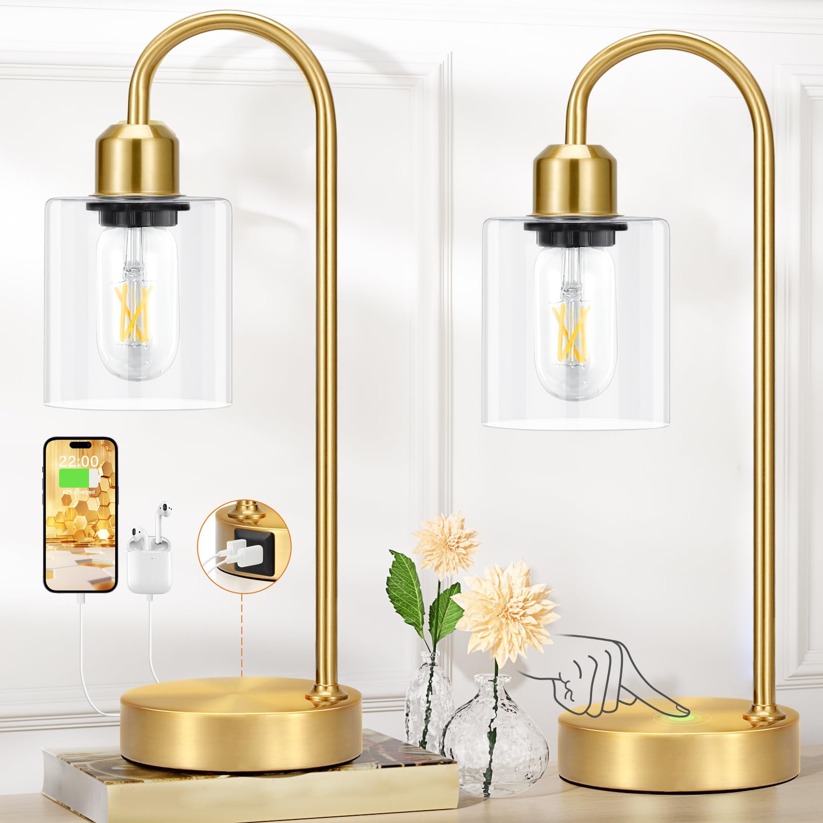 Rynx | Industrial Gold Table Lamps Set - 3 Way Dimmable Touch Table Lamps Set With 2 USB C+A Ports, Nightstand Lamp With Glass Shade, Evening Lamps For Nightstand, Bedroom, Living Room, LED Light Bulb Included
