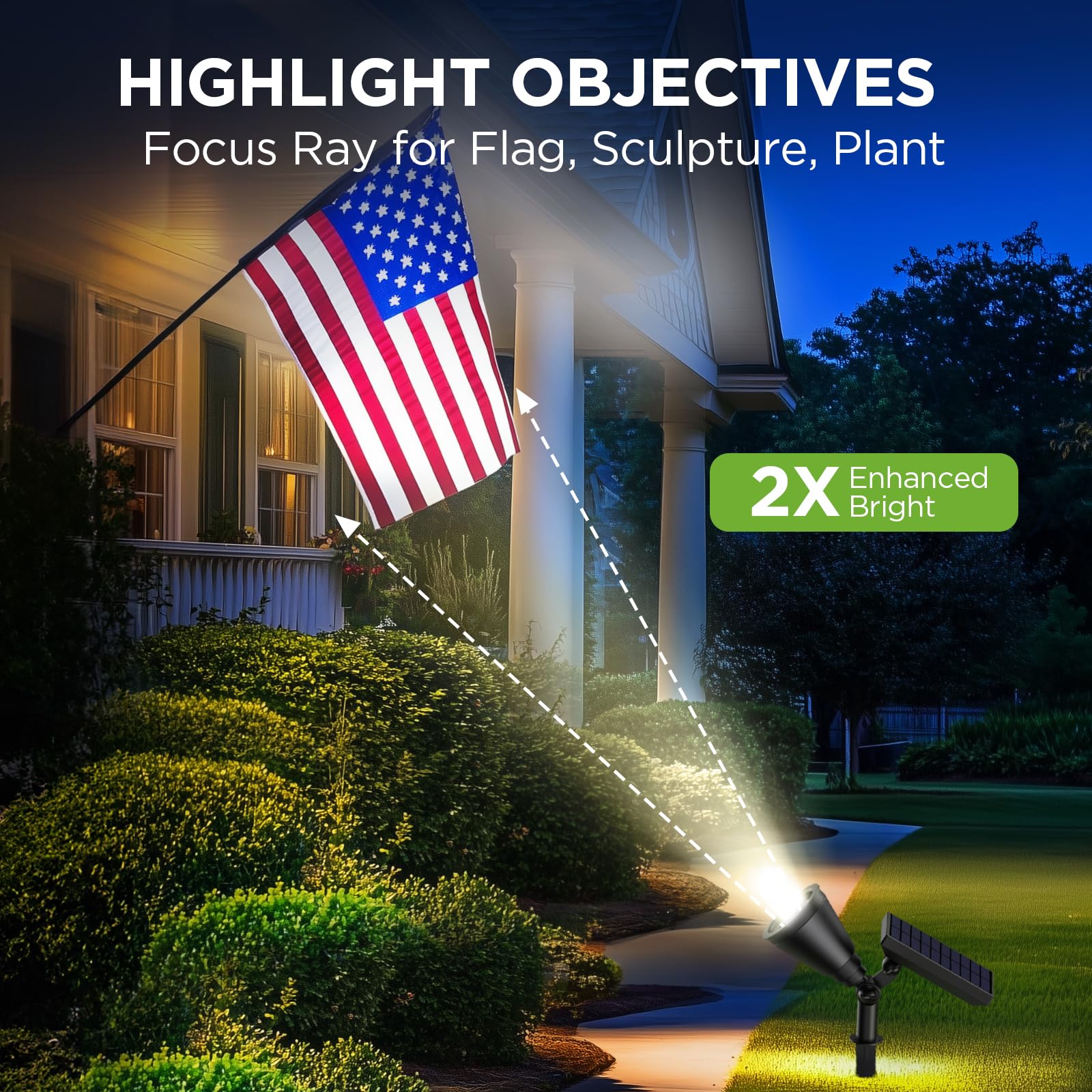 - **Enhanced brightness & dual working modes:** Experience superior brightness with our powerful solar spotlight, which is capable of casting focused beams to highlight your favorite outdoor features such as flagpoles or sculptures. Choose between High mode for maximum brightness (up to 6 hours) and Low mode for extended illumination (up to 12 hours), tailored to your specific lighting requirements.