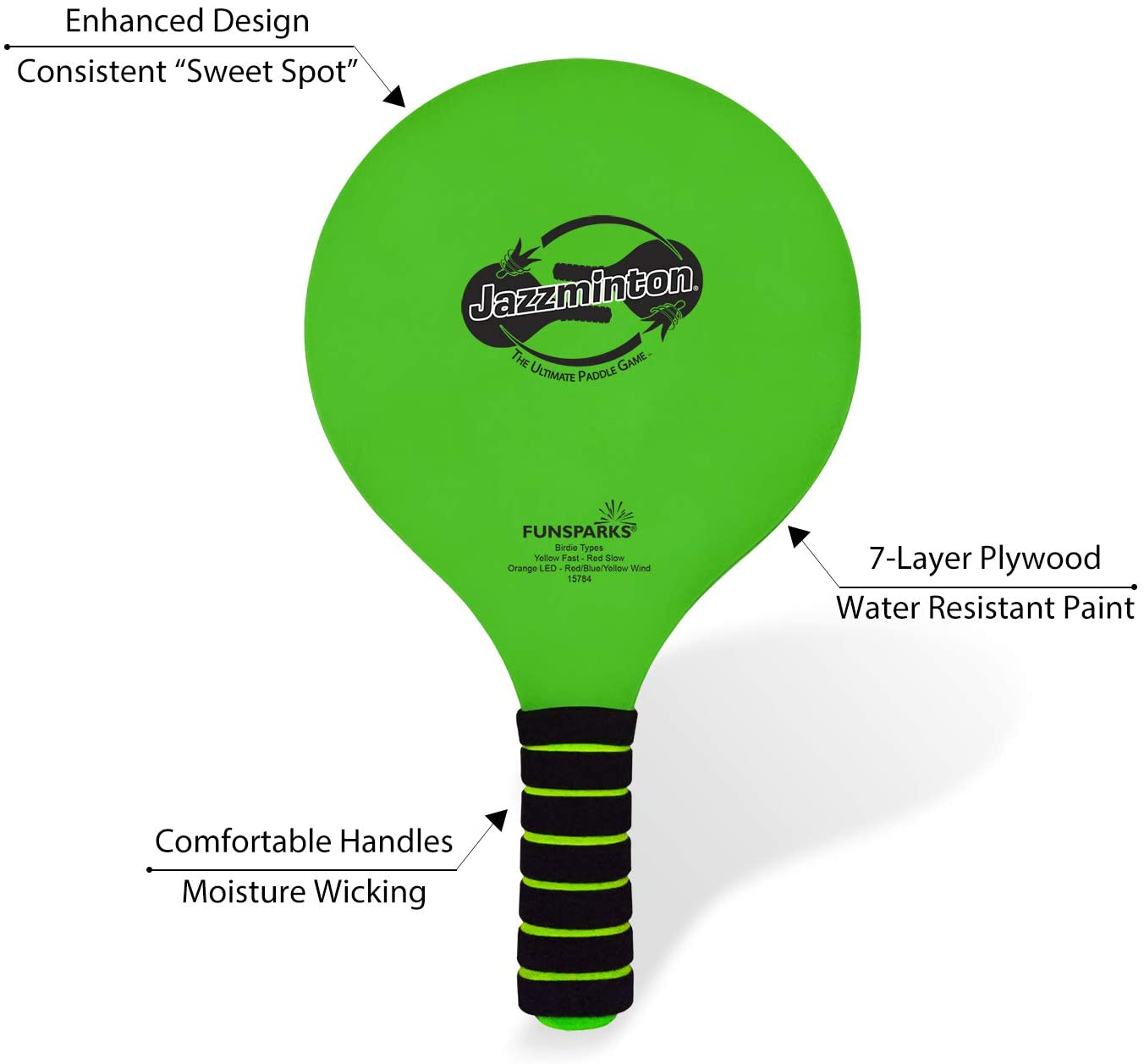 - COMPLETE SET INCLUDES: 2 fluorescent wooden rackets, 1 ball, and 4 birdies; 2 red birdies for slower play, 2 yellow for fast, plus a durable carry bag. Jazzminton paddle games offer an exhilarating, fast-paced outdoor activity for both children and adults. Step outside with Jazzminton and have fun!
