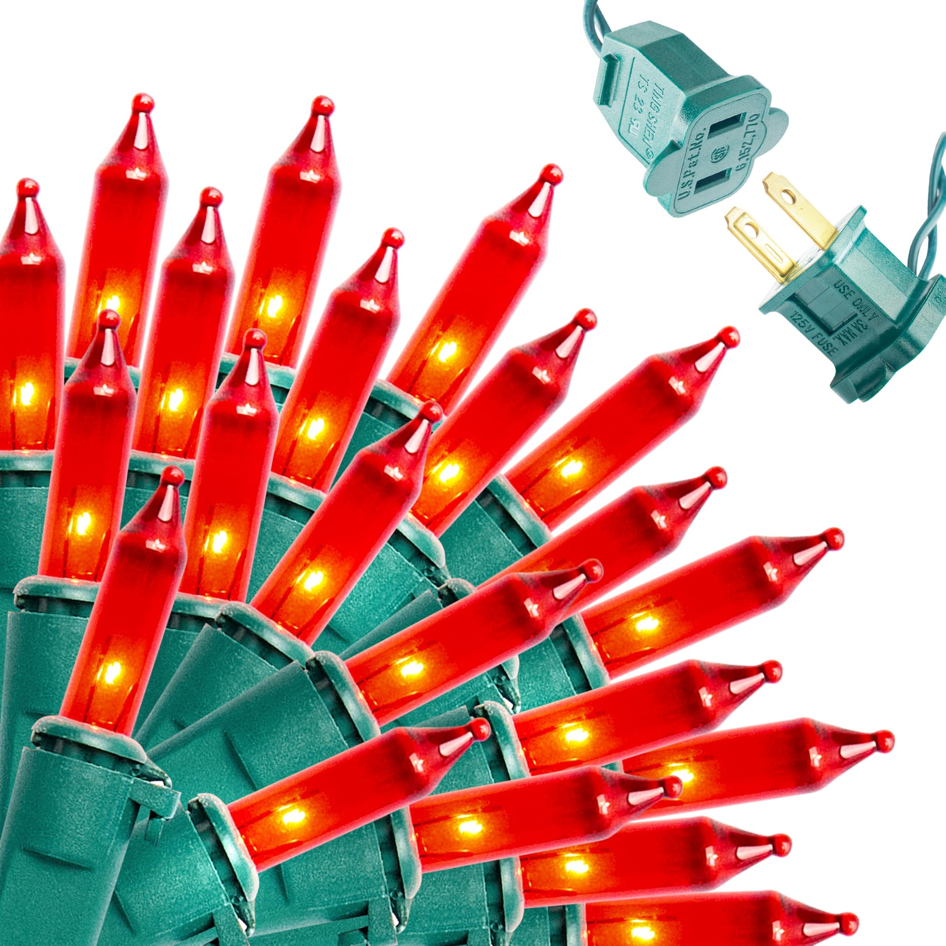 Incredible Value Package. Our Halloween string lights feature 100 red T5 bulbs and a green wire. The power consumption is 40.8W at 120V. The total length of the lights is 19.4 feet, with an overall wire length of 21.4 feet. The bulbs are spaced 2.36 inches apart. High voltage.