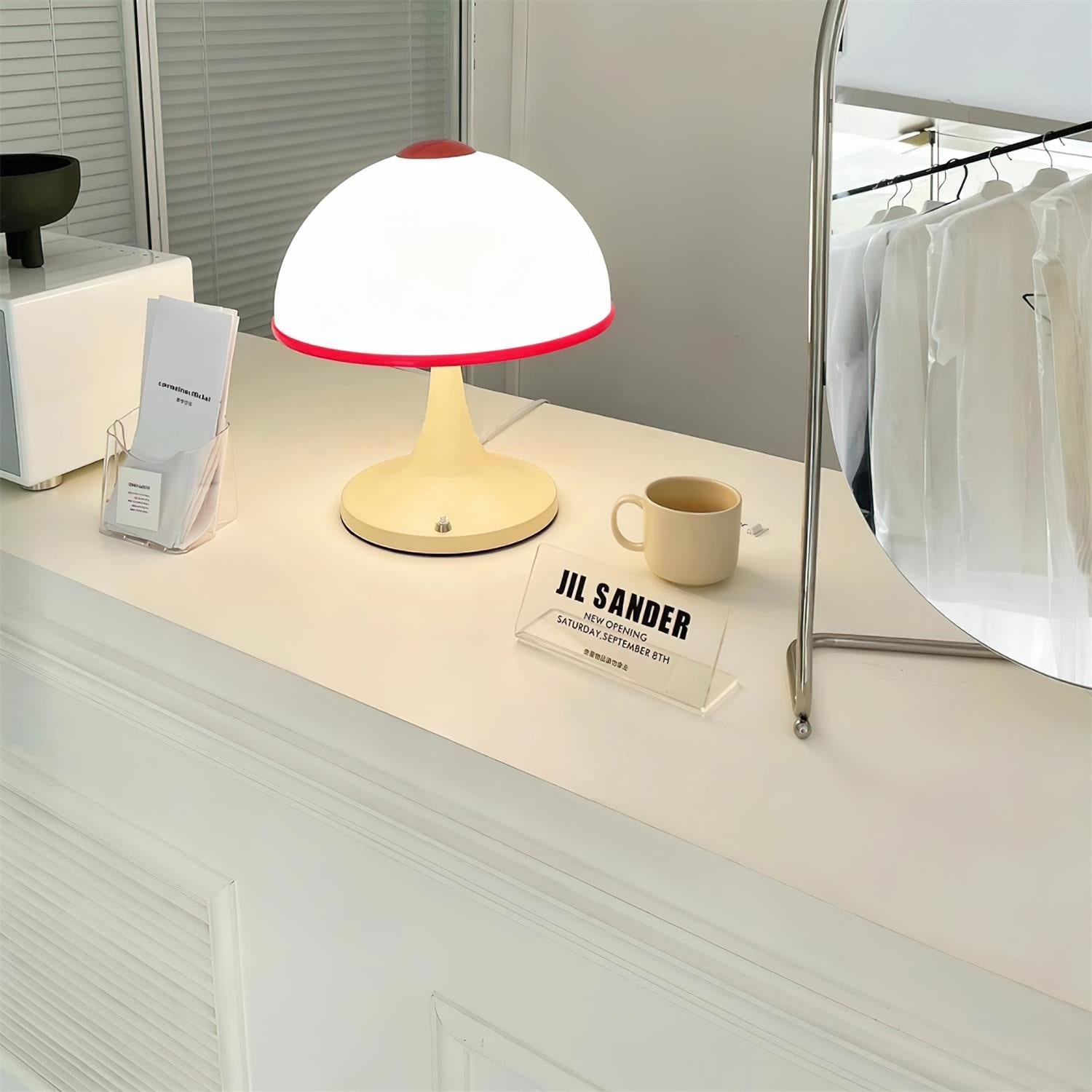 Introducing the Julie Mushroom Table Lamp, exclusively on rynx—a design that transcends the ordinary to highlight the art of subtle sophistication. Crafted with an eye for mid-century aesthetics, this lamp features a sleek, dome-shaped shade in a glossy finish, accented with a contrast color detail that adds a playful yet refined touch. The lamp's base, with its gentle curves, is finished in a matte texture that complements its shiny counterpart, ensuring that it stands as a statement piece in any setting.