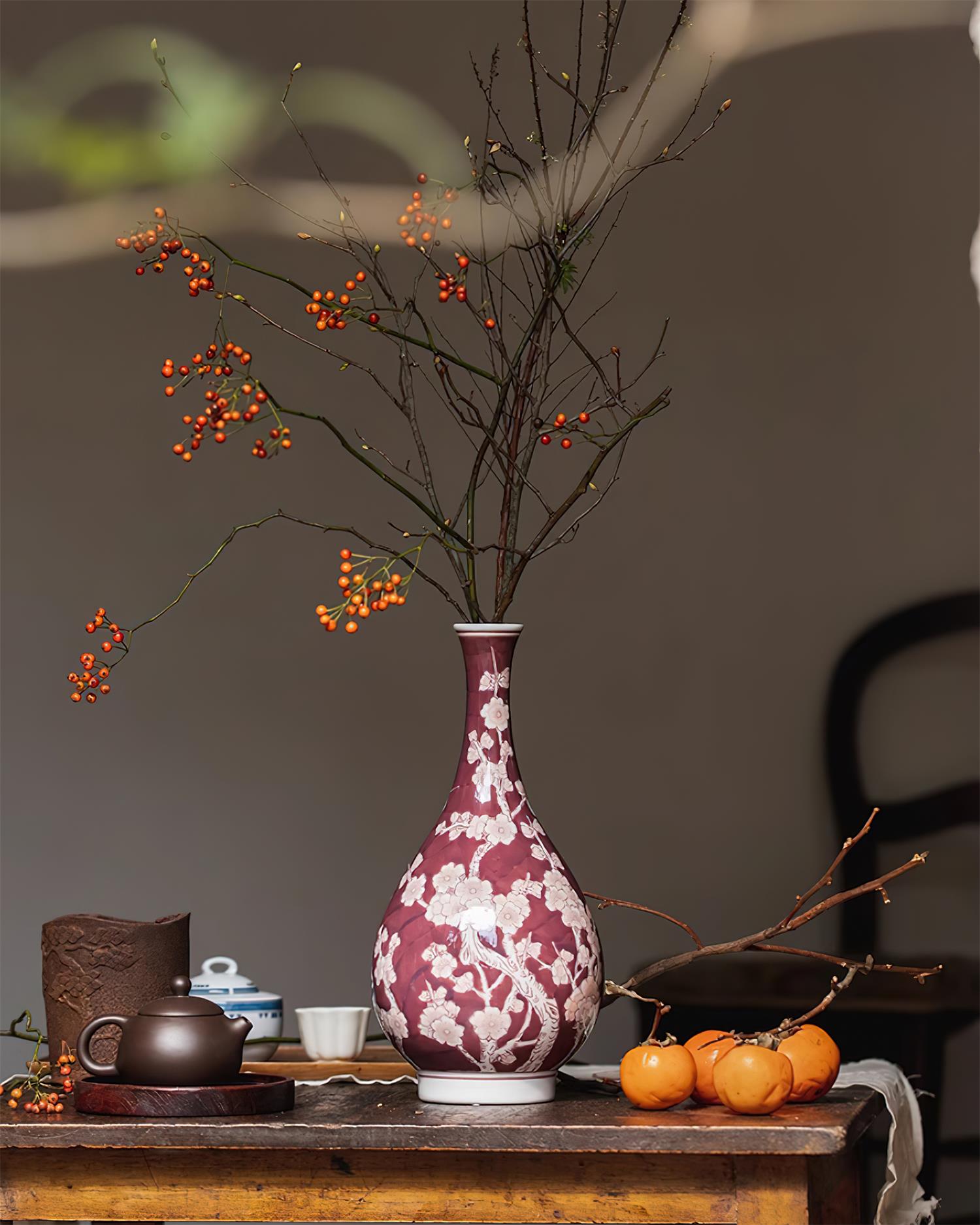 The Khali Cherry Blossom Ceramic Vase embodies the beauty of nature with its stunning depiction of delicate cherry blossoms, meticulously hand-painted on a rich burgundy background. Its glossy finish enhances the intricate details of the floral design, capturing the essence of traditional art while blending seamlessly into modern décor. Whether used as a standalone centerpiece or for displaying fresh blooms, the Khali vase brings a sense of serenity and timeless elegance to your space.
