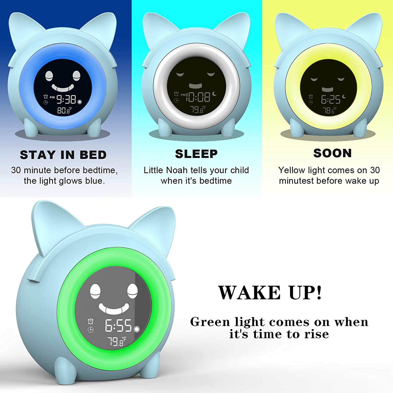 - Versatile Toddler Alarm Clock: The clock can be set to 12/24-hour display according to the child's preference. It has various features such as a nap timer, indoor temperature monitor, child lock, adjustable volume, 3 sleep sounds, and 5 night lights that change color, etc.