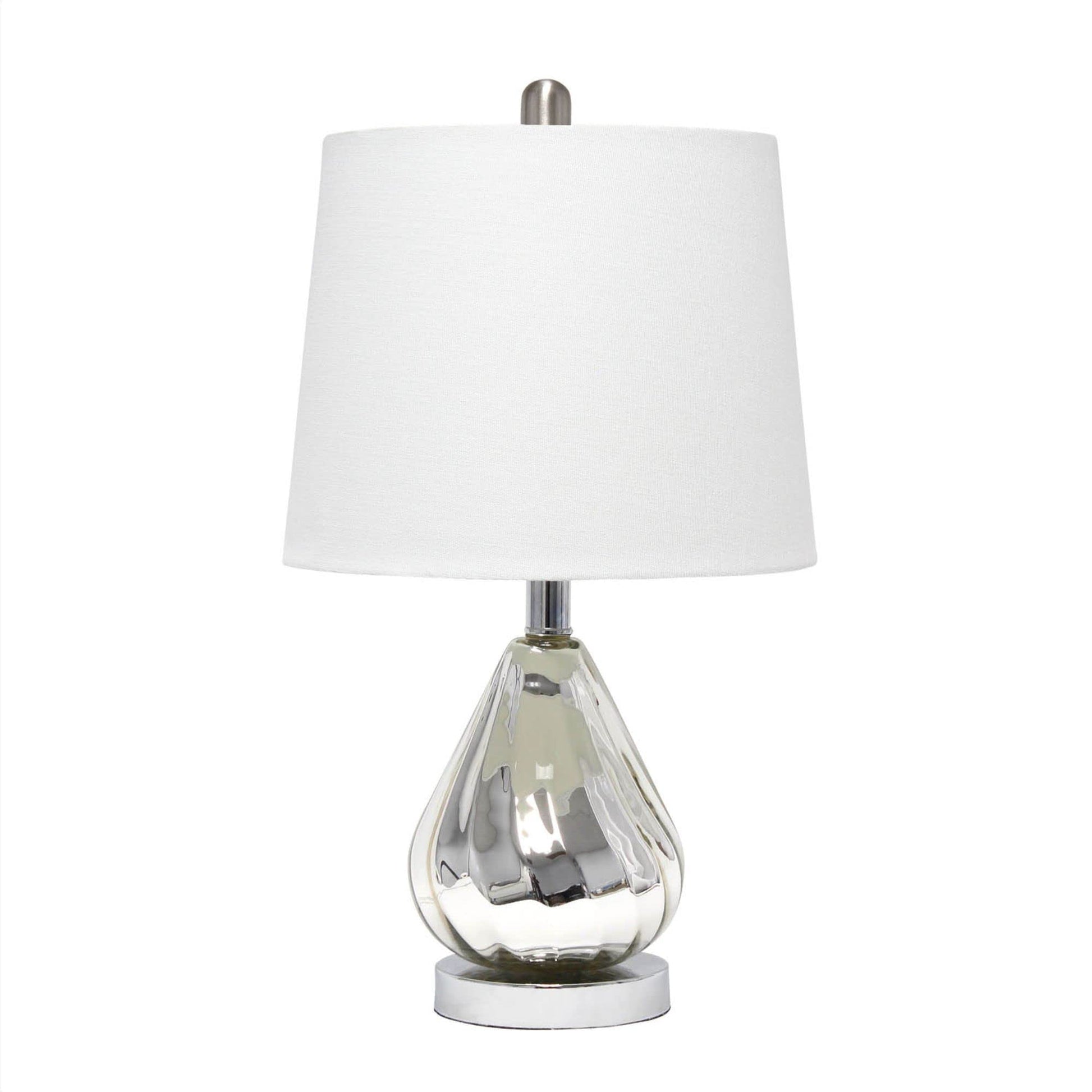 Enhance your space with this stylish chrome glass lamp. The white fabric shade beautifully complements the base with its shimmering surface and subtle wave pattern. Perfect for the living room, bedroom, office, or any area where you want to add a touch of glamour! Material composition: 48% fabric, 48% glass, 3% metal, 1% plastic. Easily accessible toggle switch located on the base.