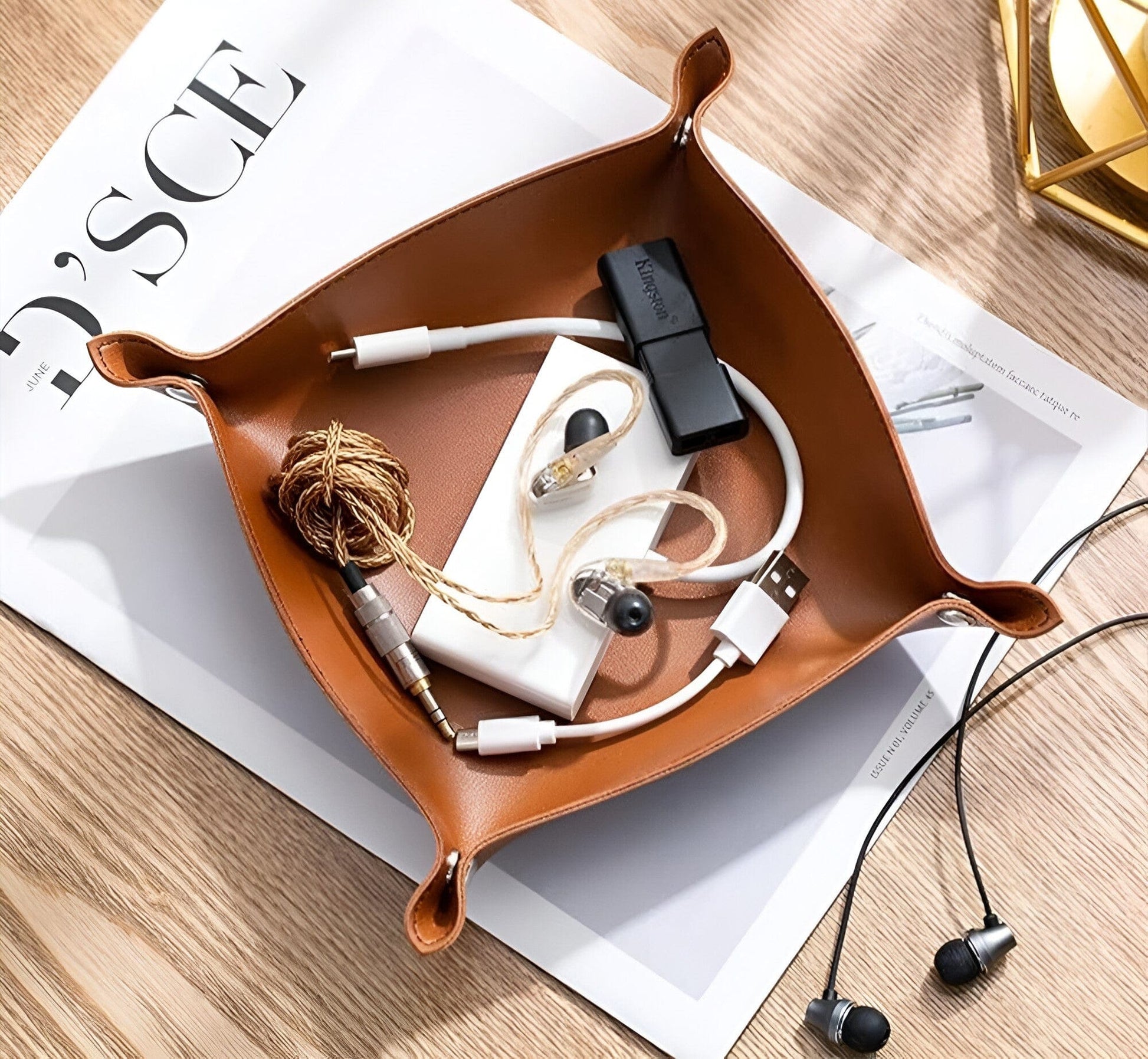 Store your most important items in style with our leather Tray Catchall storage box, an elegant and refined way to organize your space. Made from high-quality leather, this tray offers a spacious interior, perfect for keeping keys, coins, jewelry, and other small items.