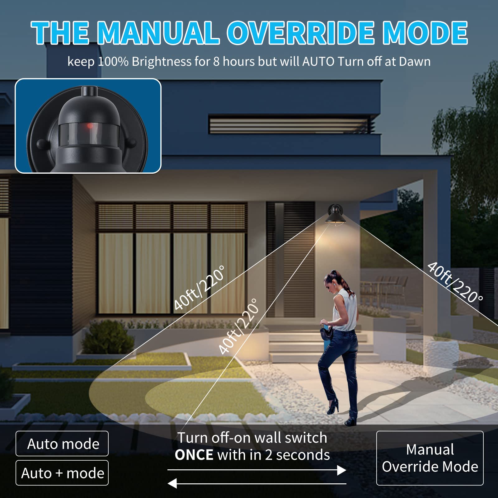 - **Distinct Manual Override Mode**: Customize your lighting to suit various situations with the option for continuous light for 8 hours. Switching to manual mode is simple by toggling the wall switch off and on twice, allowing for 100% brightness throughout the night, which automatically turns off at dawn.