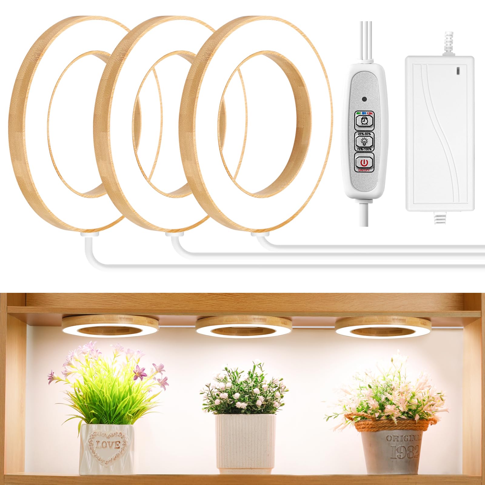Rynx | Lordem 6.3" Bamboo Ceiling Grow Lamp For Indoor Plants, 216 Leds Full Spectrum Halo Plant Light, Under Cabinet Grow Light With 4/8/12H Auto Timer Switch Modes, 4 Dimmable Brightness Levels, Tri Head