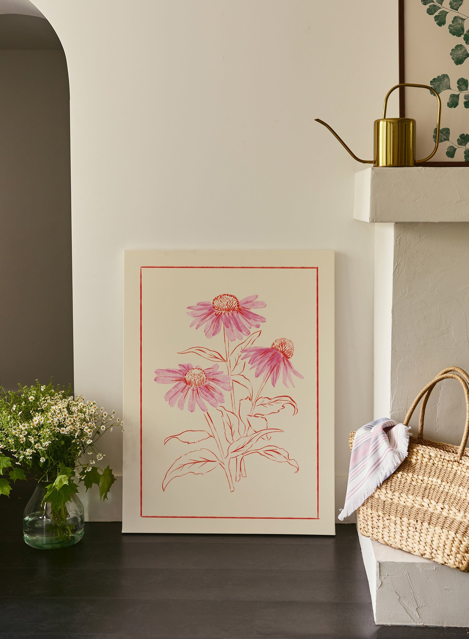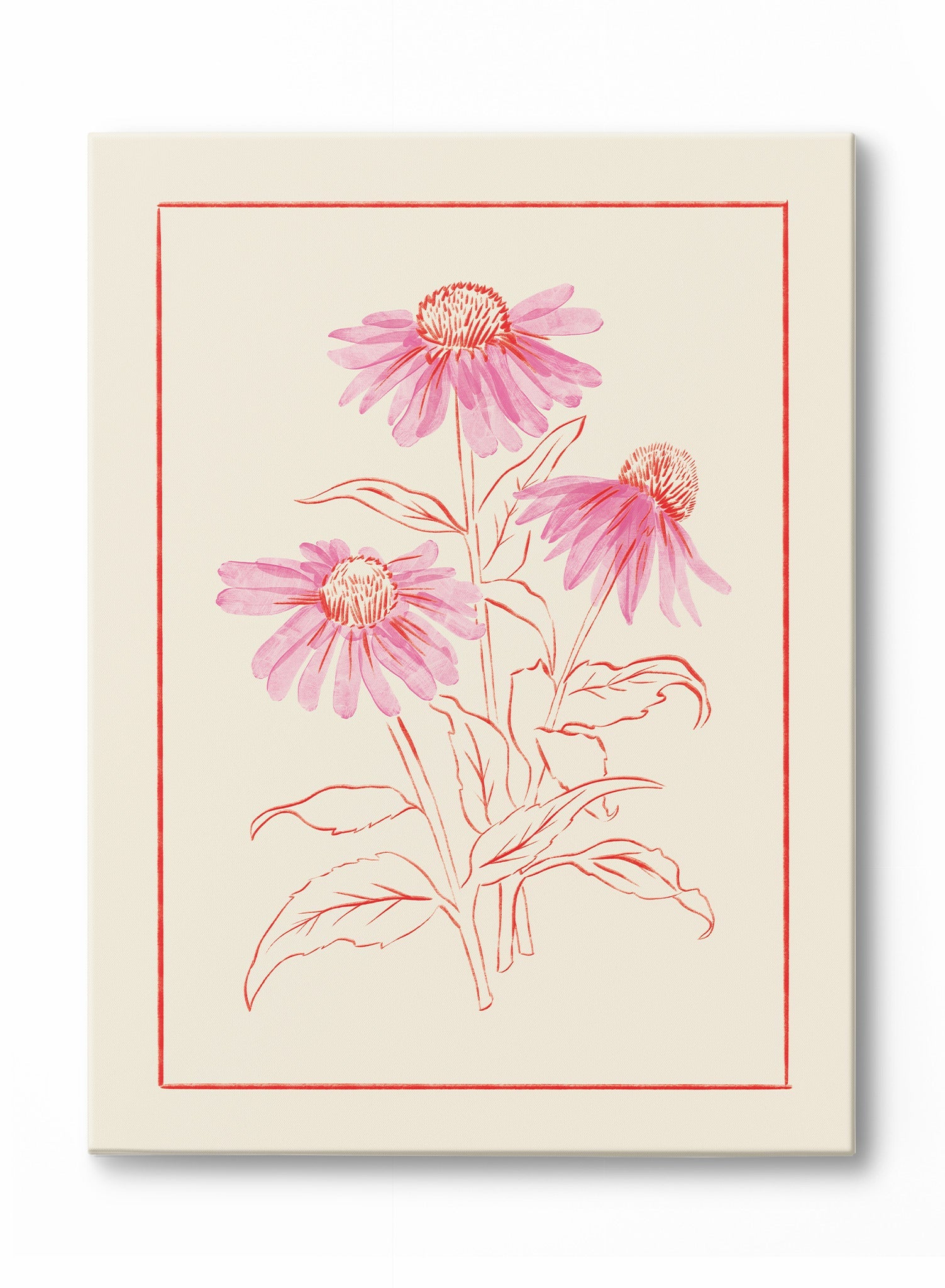 This floral artwork features three pink Echinacea flowers, with their stems and leaves sketched in red against a white backdrop..