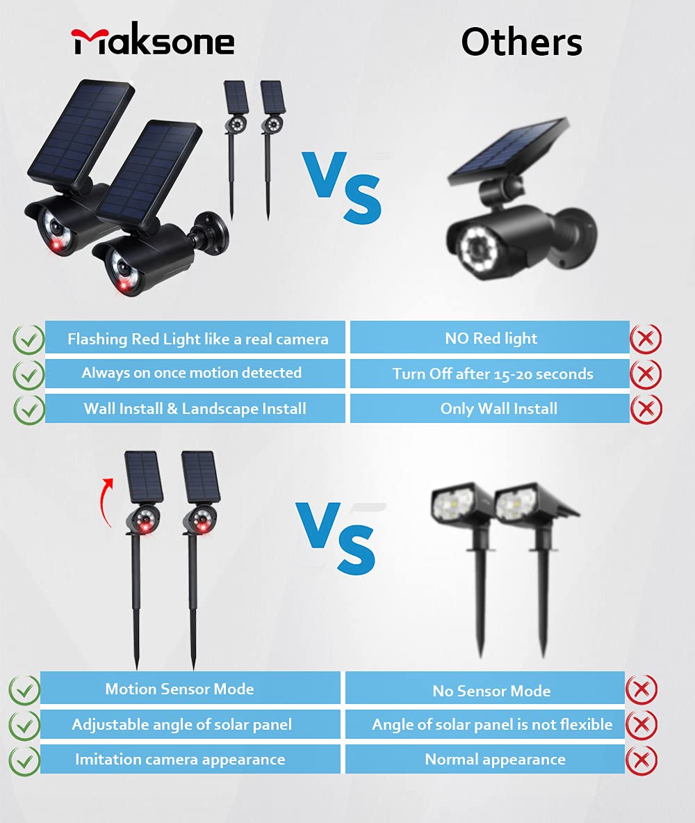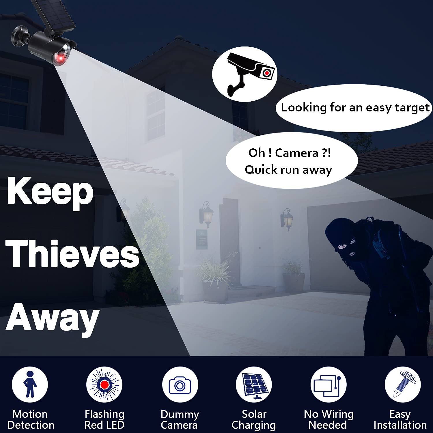 - **Energy Efficient**: Designed for effectiveness, the solar lights come with a built-in photcell sensor that automatically turns off during the day and activates at night upon detecting motion. When there is no movement, the red LED light remains on as a dummy camera, effectively tricking intruders.