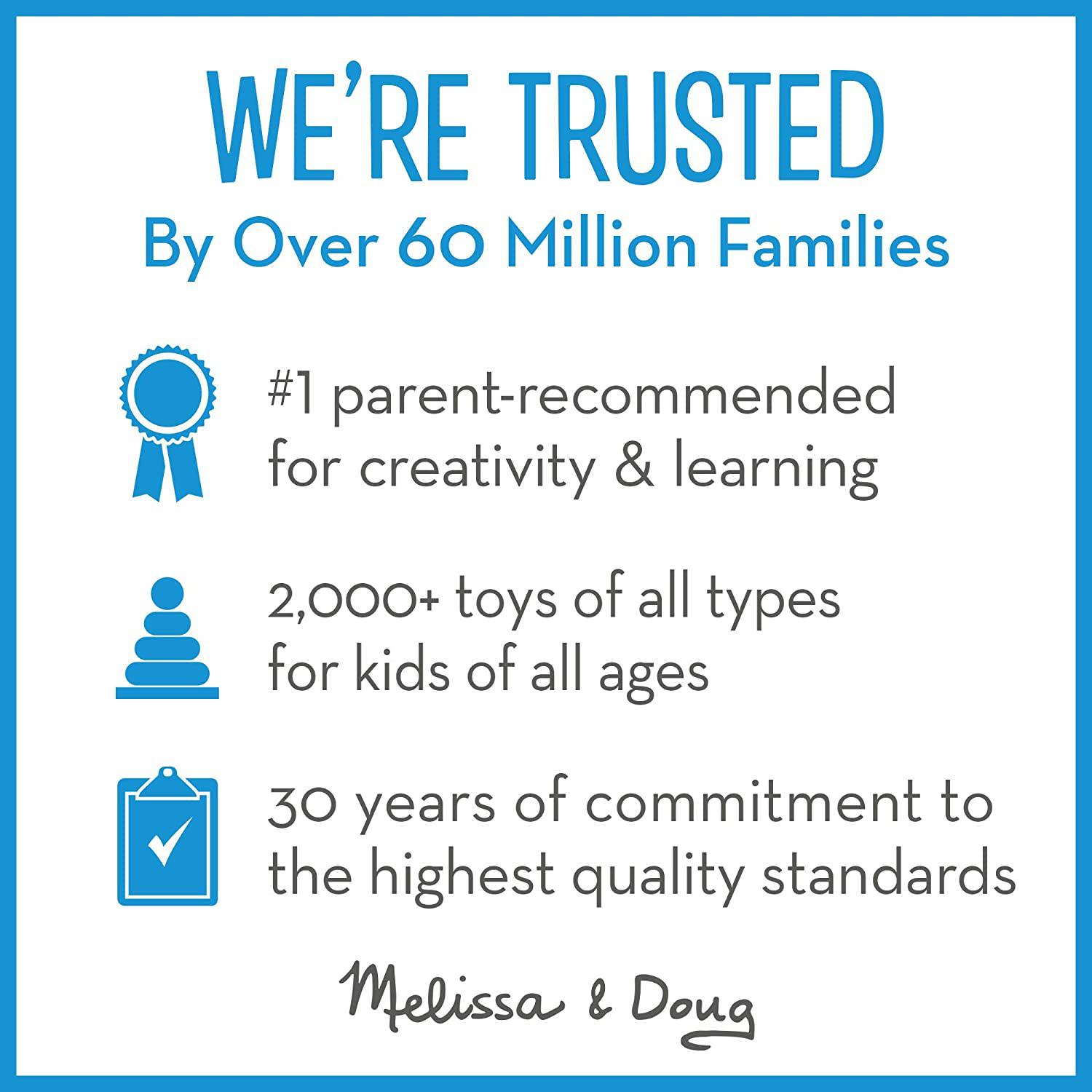 For over 30 years, Melissa & Doug has been creating beautifully designed products that spark imagination and creativity, which NBC News has called “the gold standard in early childhood play.” We design each toy according to the highest quality standards to nurture both minds and hearts. If your child isn't inspired, give us a call, and we’ll make it right. Our phone number is on every product!