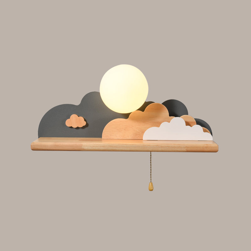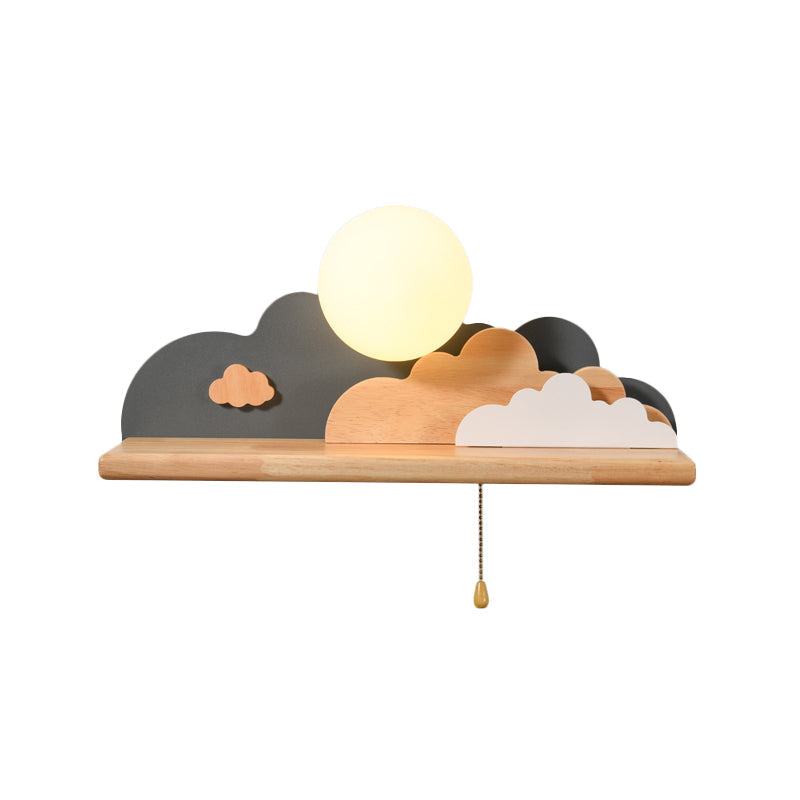 Rynx | Modern Cloud Wood Wall Light 1 Light Wall Mounted Fixture in Blue/White/Grey with Round Glass Shade and On/Off Pull Chain