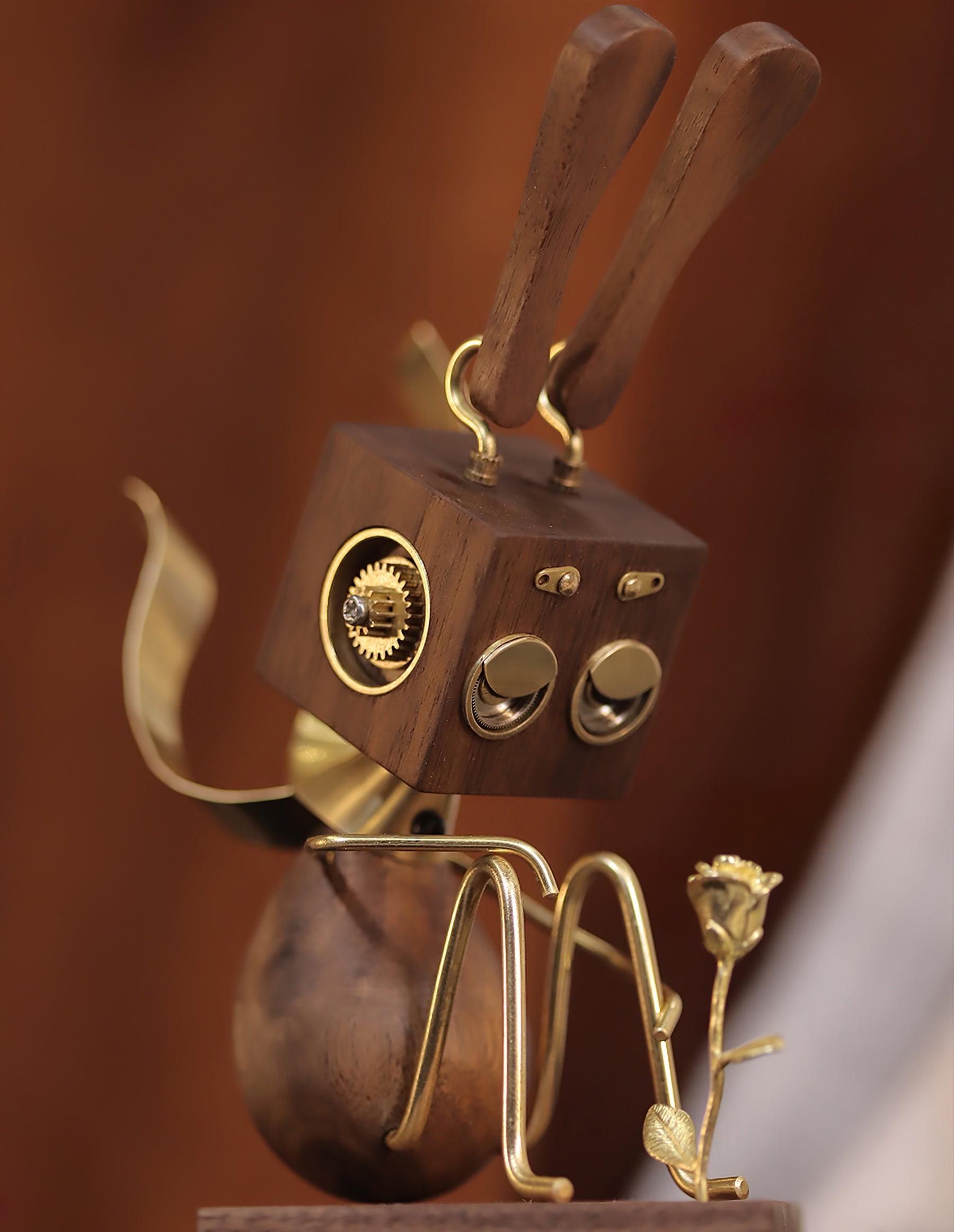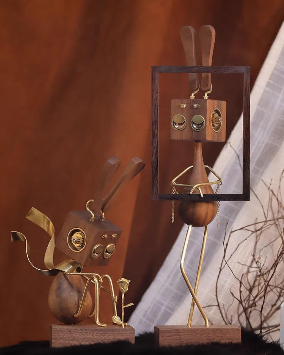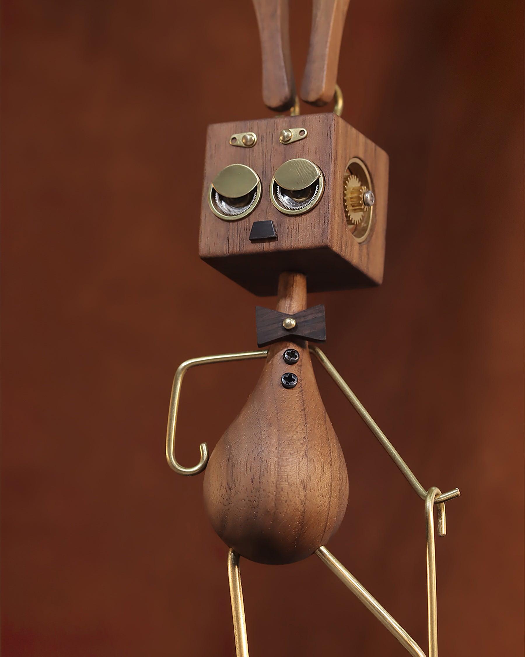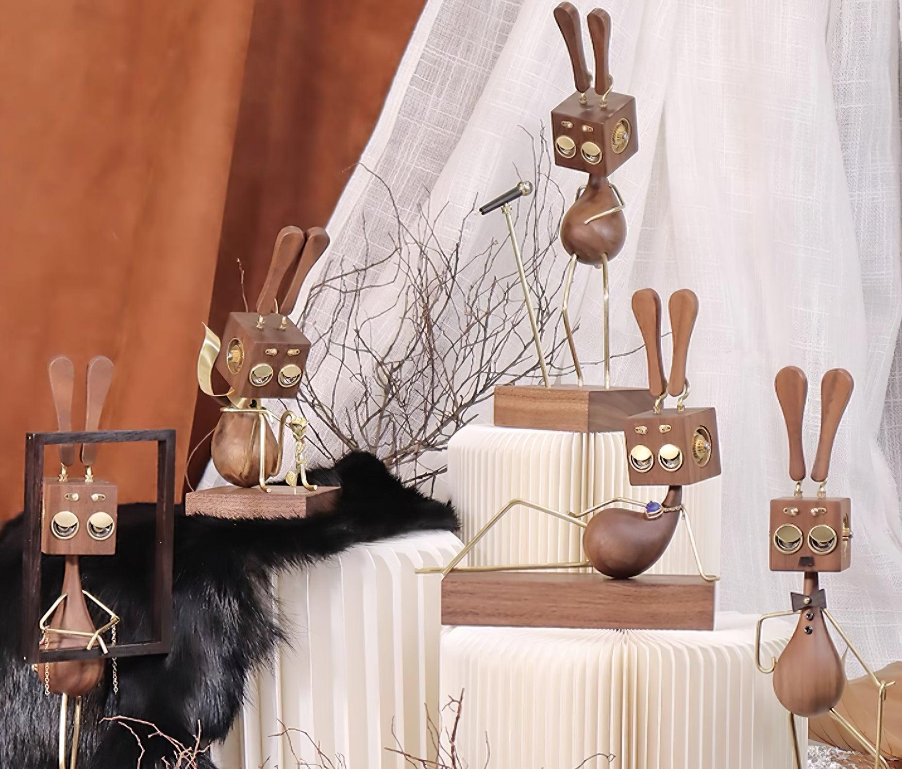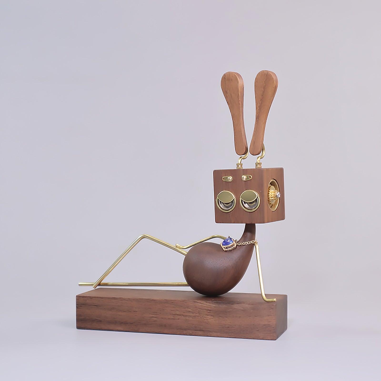 Meet the Walnut Rabbit, a whimsical fusion of natural woodwork and imaginative design. This charming figurine brings a playful spirit to any room, with its exaggerated features and poised stature, reminiscent of a character straight out of a storybook. Crafted from rich walnut wood and accented with elegant brass details, this decorative piece stands tall, marrying the rustic with the fantastical.