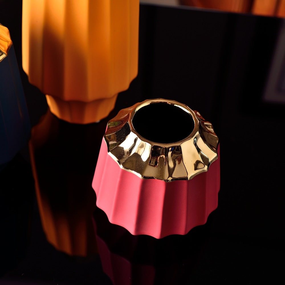 Solid Color Vase: This artistically crafted ceramic vase is handmade and impresses with its clean vertical lines. The upper part of the vase is adorned with a bronze accent, creating a unique and appealing piece of art that reflects the beauty of color.