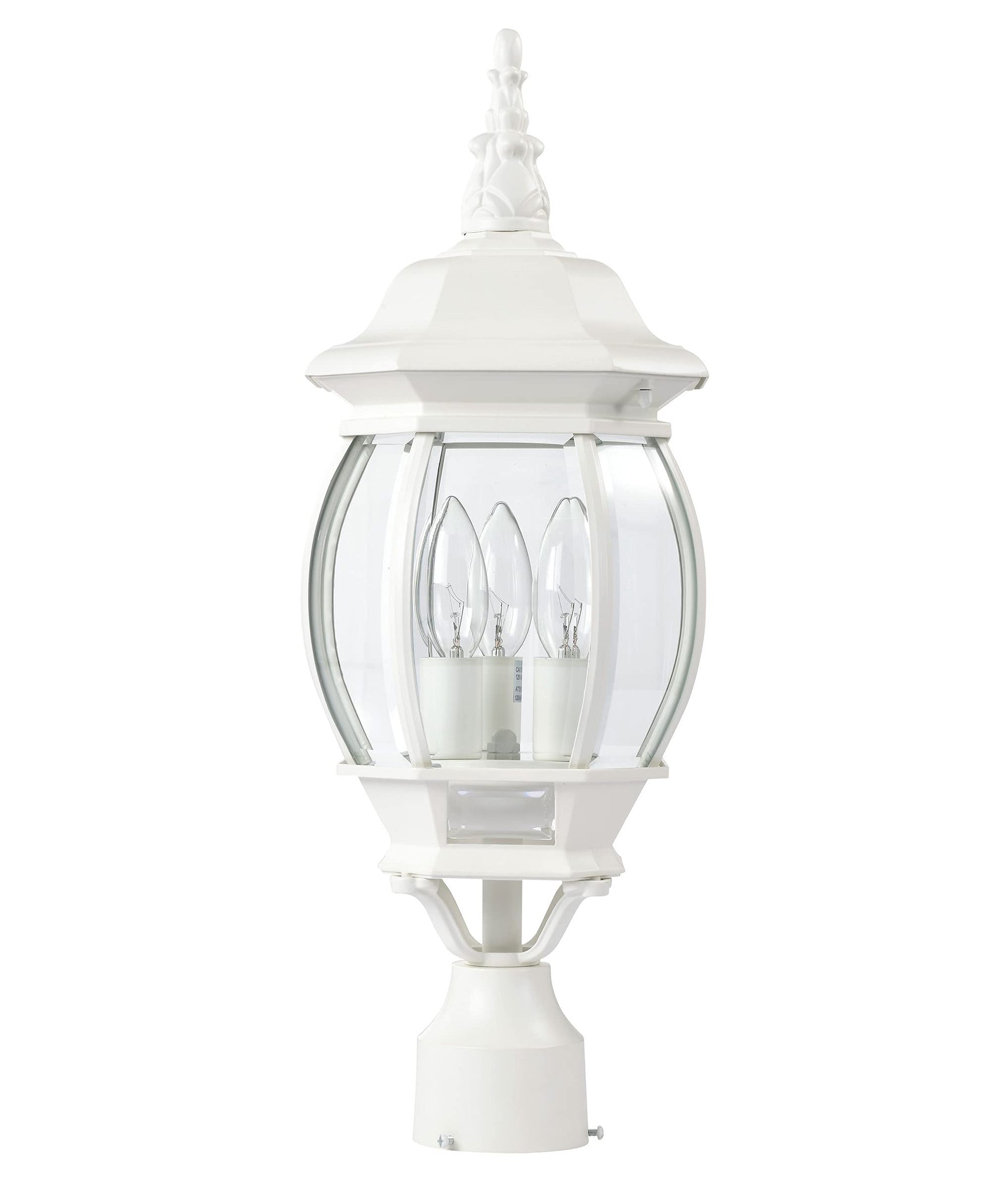 Nuvo Lighting 60/897 Classic three-light fixture with post mount from the Central Park collection in a white finish, Height: 21.00 inches Width: 7.38 inches Style: Classic Light Type: Outdoor Safety Rating: cULus and safety listing: Wet Number of lights: 3, Bulb type: B, Bulb(s) included: No