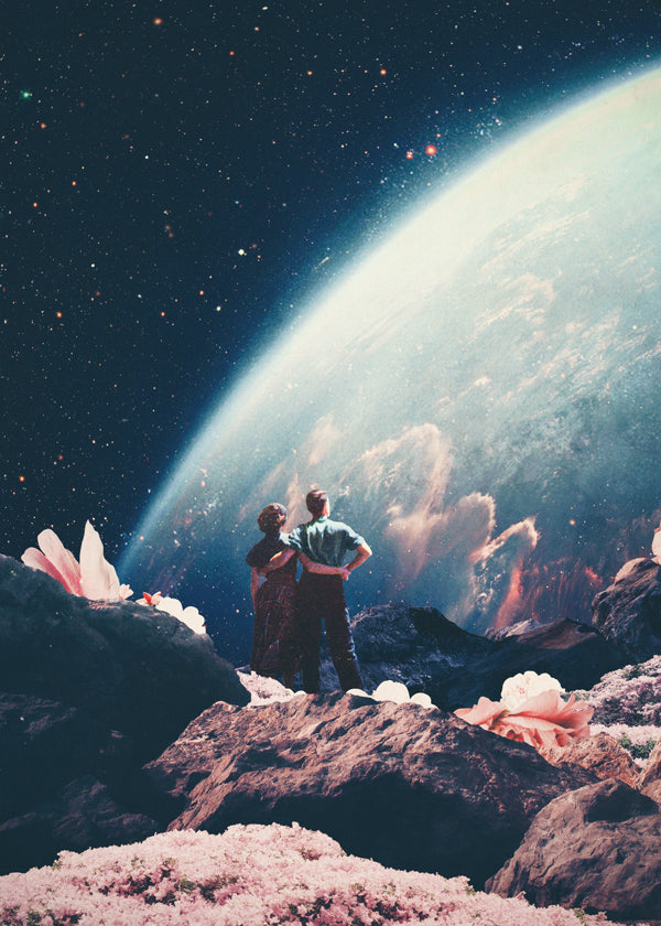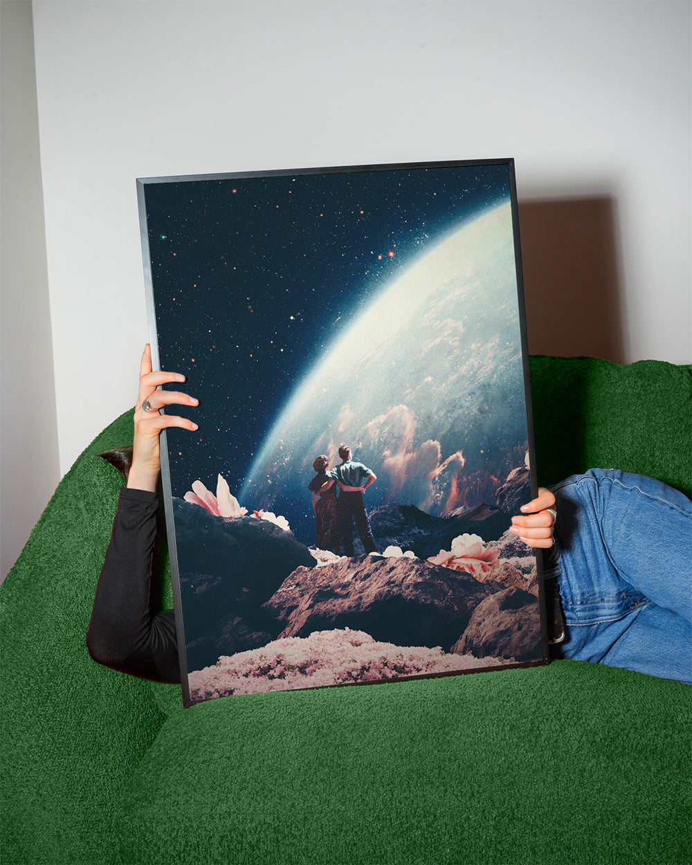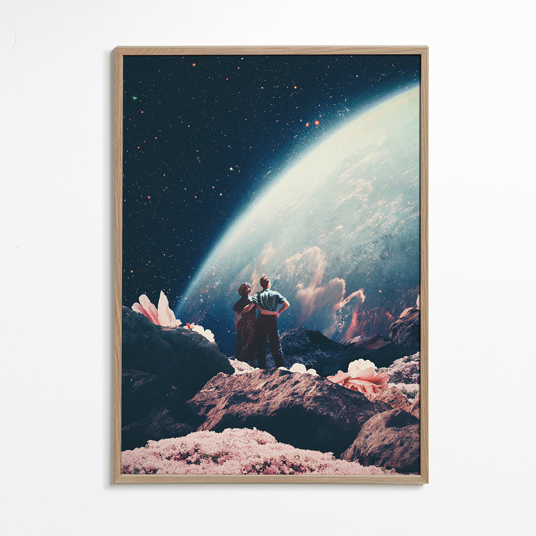 A poster from our collection of planet art by Frank Moth, featuring a blue and vertical layout. This retro style is ideal for a vintage appearance. The perfect blend of uniqueness and design.