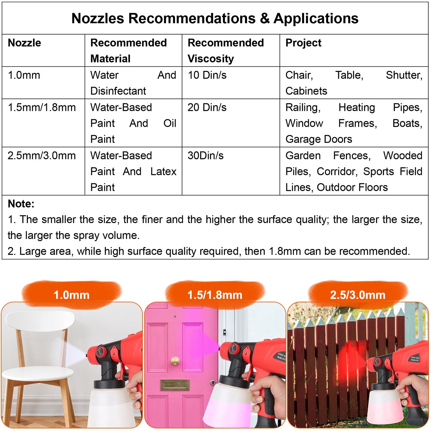 - Multiple Brass Nozzles: Comes with 5 nozzles in different sizes, including 1.0/1.5/1.8/2.5/3.0 mm, suitable for oil-based paint, water-based paint, latex paint, disinfectants, and more paints that can flow out of the viscosity cup within 20 seconds. The 1.0mm nozzle is meant for water and disinfectants, while the 1.5mm/1.8mm nozzles are for water-based and oil-based paints, and the 2.5/3.0mm nozzles are for water-based and latex paints.