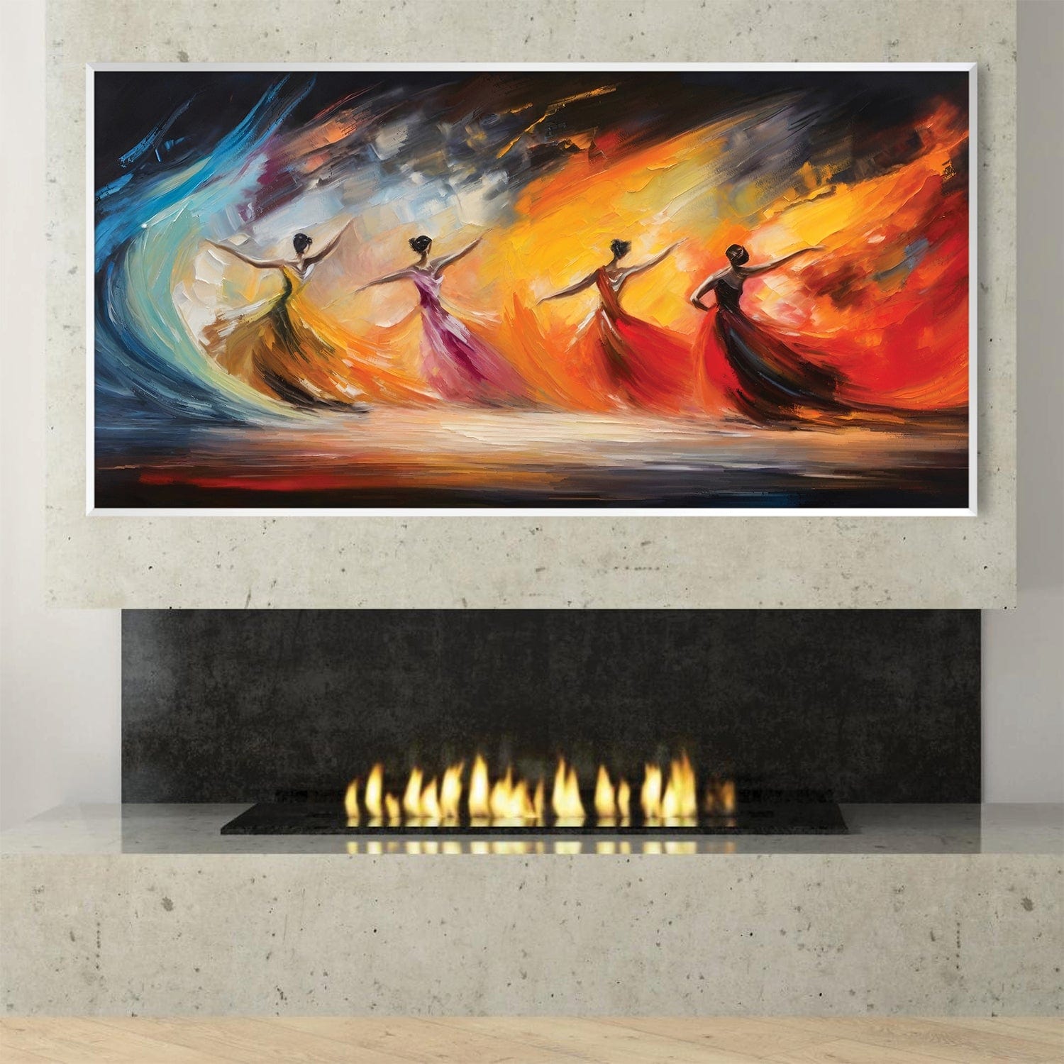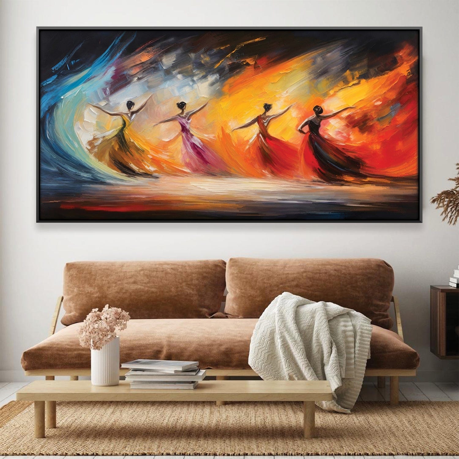 Infuse your living space with the vibrancy of dance through 'Painted Dancers', a captivating oil painting that captures the essence of motion and a play of colors. This artwork features four graceful dancers adorned in brightly colored attire, set against a dynamically crafted background with a textured effect. The harmonious blend of reds, yellows, and blues creates a lively and expressive ambiance, making 'Painted Dancers' a visual tribute. Whether displayed as wall art or elegantly framed, this piece adds a touch of energy and artistic flair to any room. Revitalize your decor with the rhythmic elegance of 'Painted Dancers' and let the joy of dance invigorate your living area.