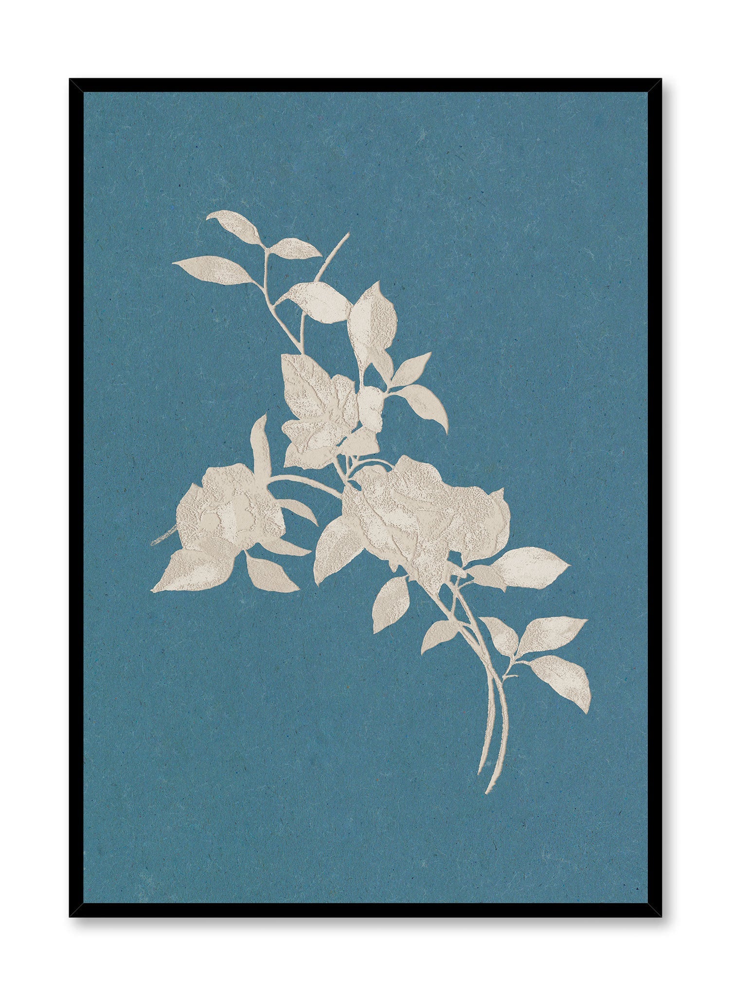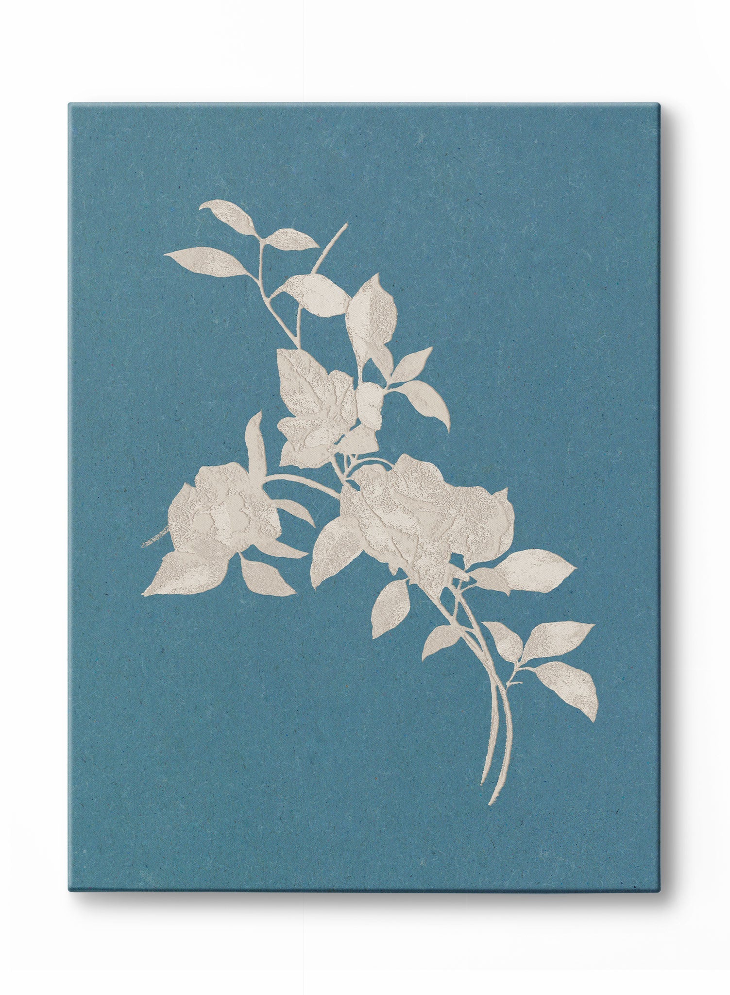 Delicate, ivory-colored flowers bloom against a textured blue backdrop, their crisp outlines exuding a serene elegance. The minimalist layout emphasizes the intricate details of the petals and leaves, creating a calming and timeless appeal.