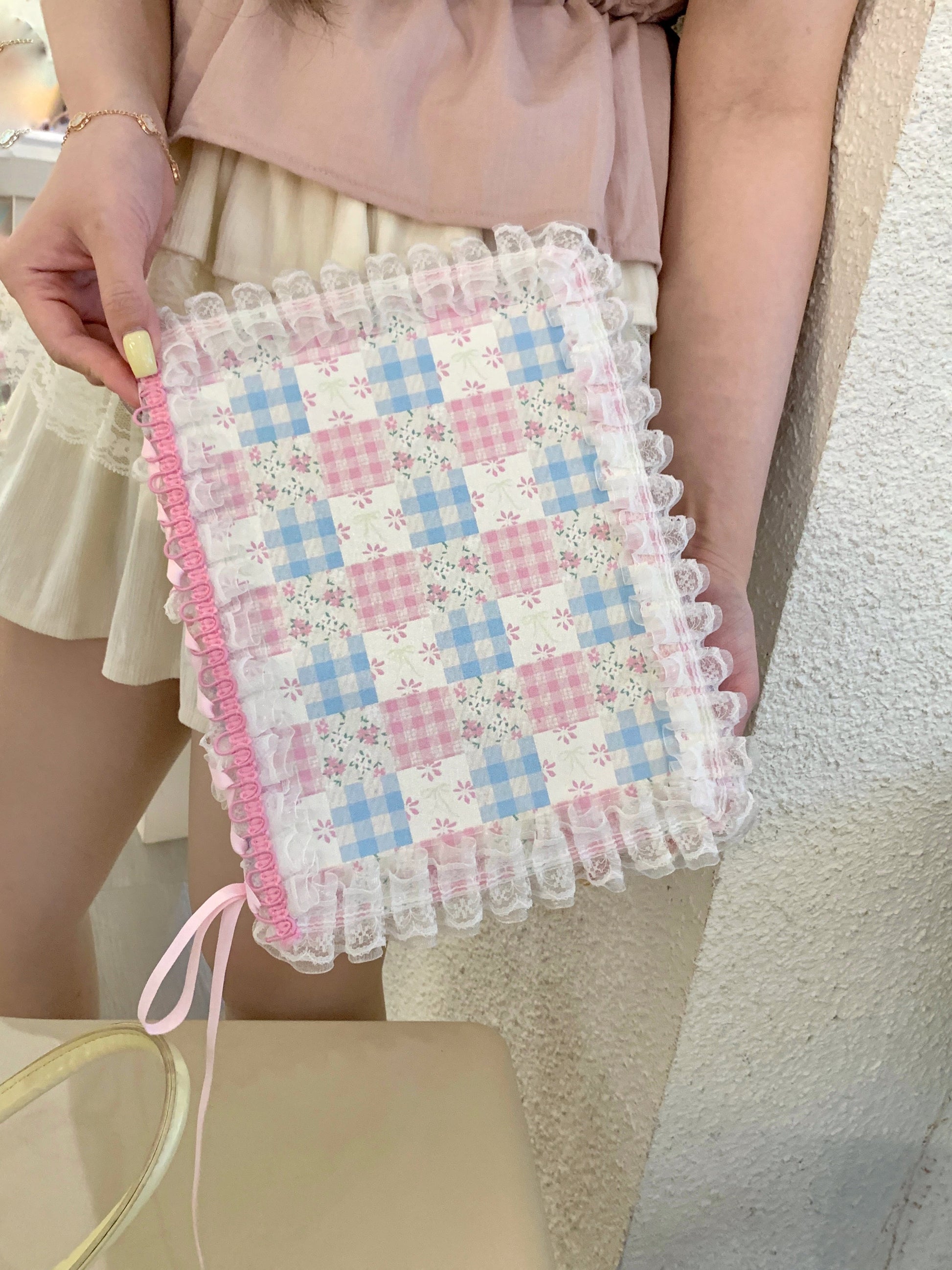 Rynx | Pastel Gingham Lace iPad Case – Pink & Blue Flower Stand Cover with Ruffle Hem