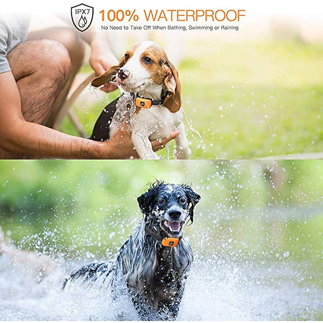 - 100% WATERPROOF SHOCK COLLAR: This remote-controlled dog shock collar has a sealed rubber plug design on the charging port, ensuring it is completely waterproof. You won't have to worry about it getting damaged when your dog plays outdoors on a rainy day or swims in the pool. You can even bathe your dog without removing it. (Note: The remote control is not waterproof)