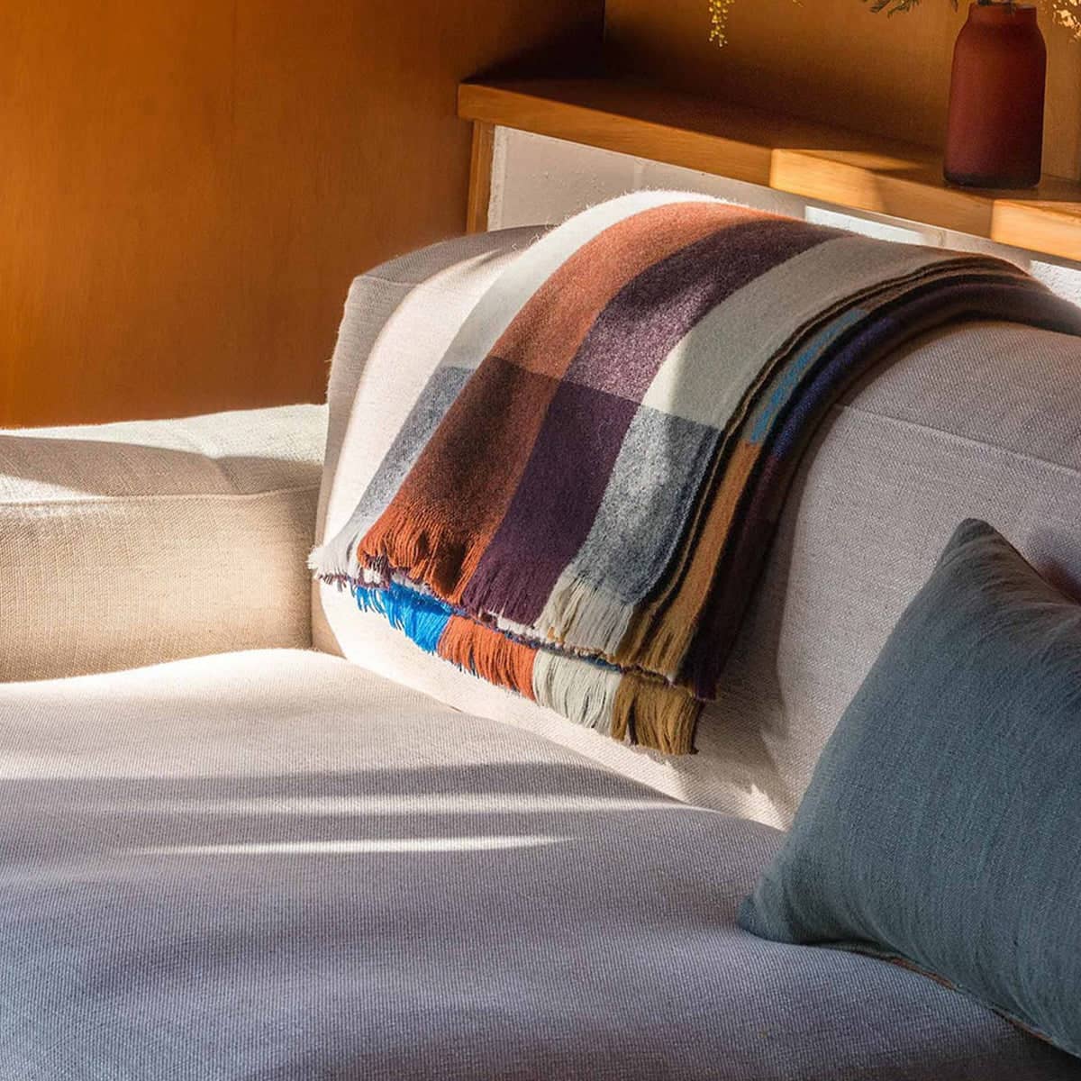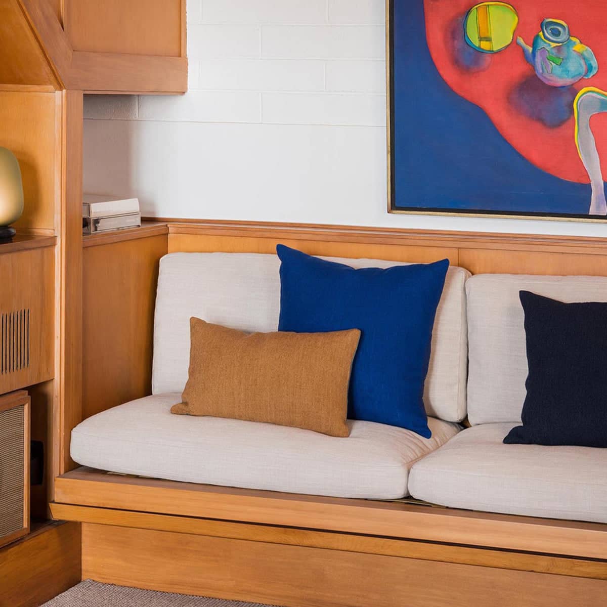 The Piccolo cushion cover features a versatile reversible two-tone design. It showcases an unexpected color palette of soft mist contrasted with vibrant orange. These cushions are perfect for any room and can be paired with others to bring color and texture to your home.