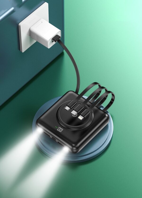 -This is a built-in, rechargeable lithium-ion battery equipped with 4 cables and dual USB outputs, designed to meet the needs of various digital devices.