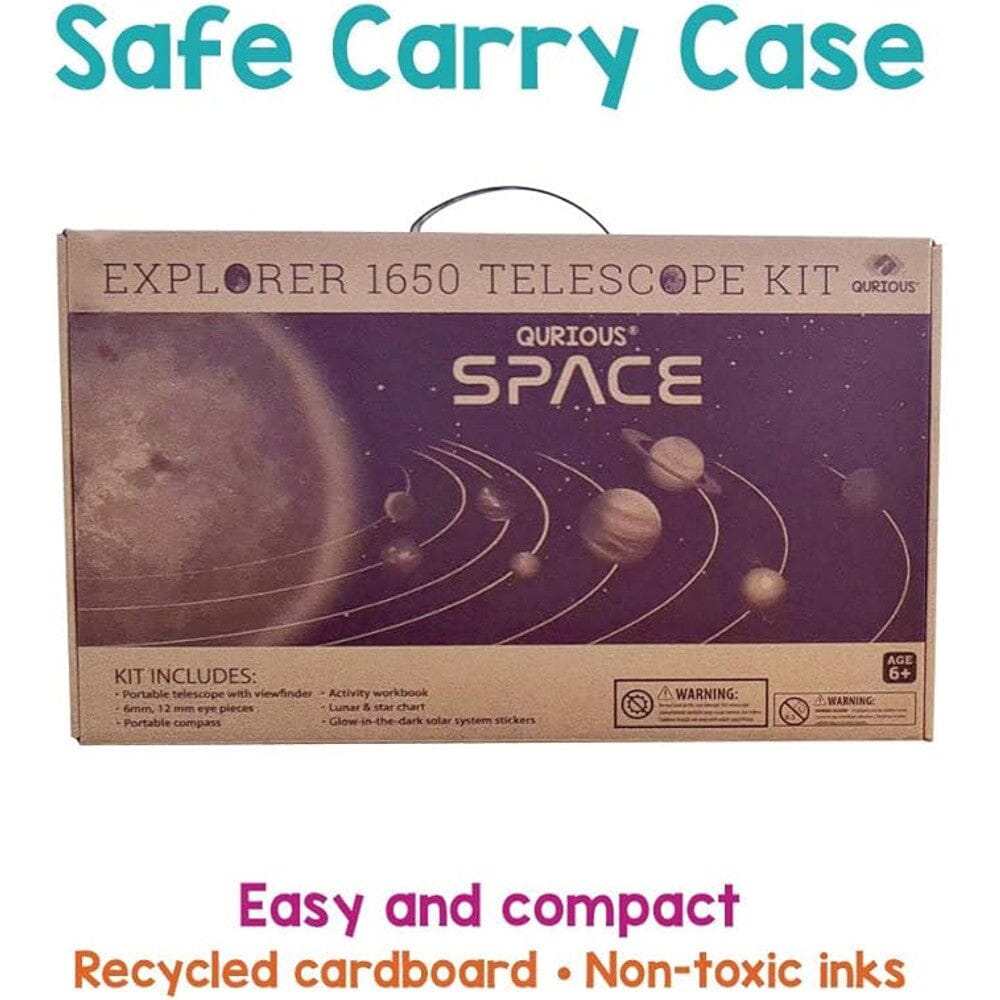 Discover the wonders of the universe with the Qurious Space Kid's Explorer 1650 Telescope Kit. This tabletop telescope features a sturdy tripod, an engaging activity guide, star and moon maps, along with fun stickers for an educational and interactive adventure. Easily explore planets, stars, and galaxies with this user-friendly kit.