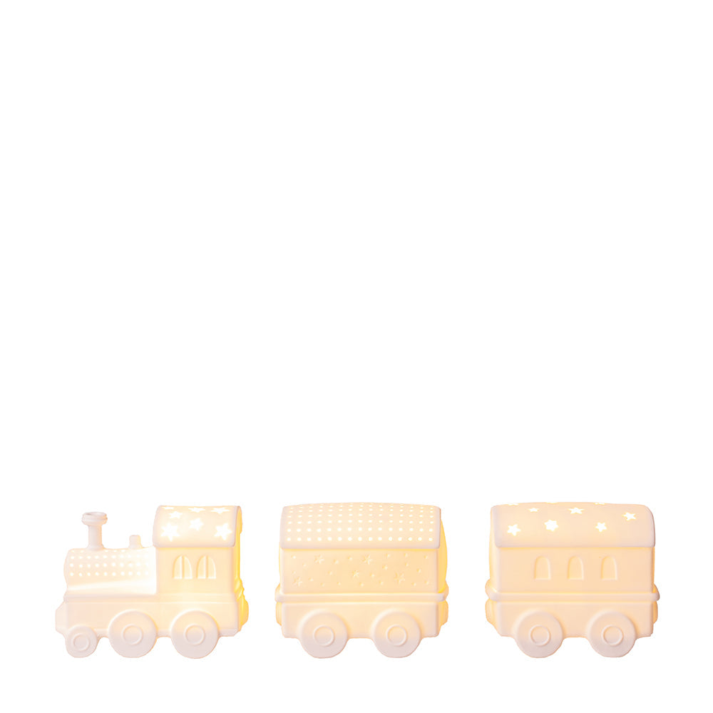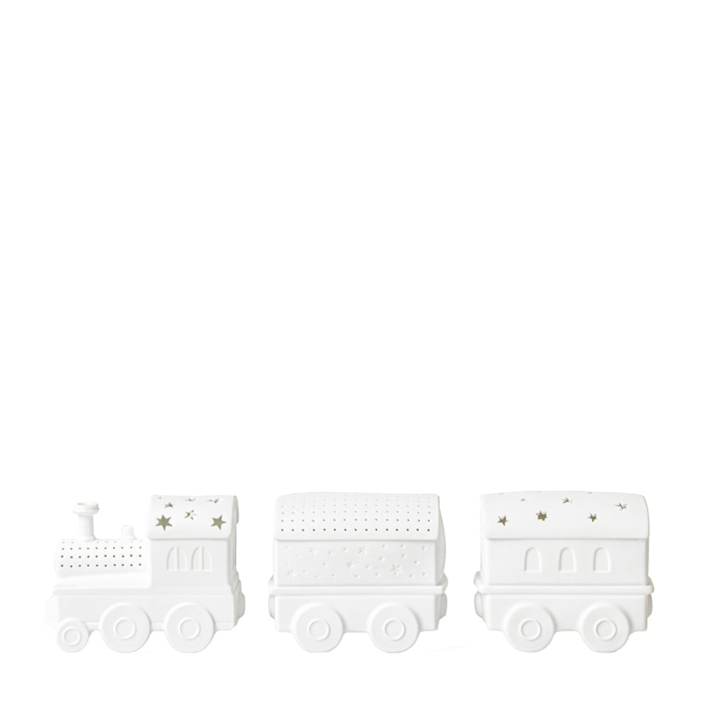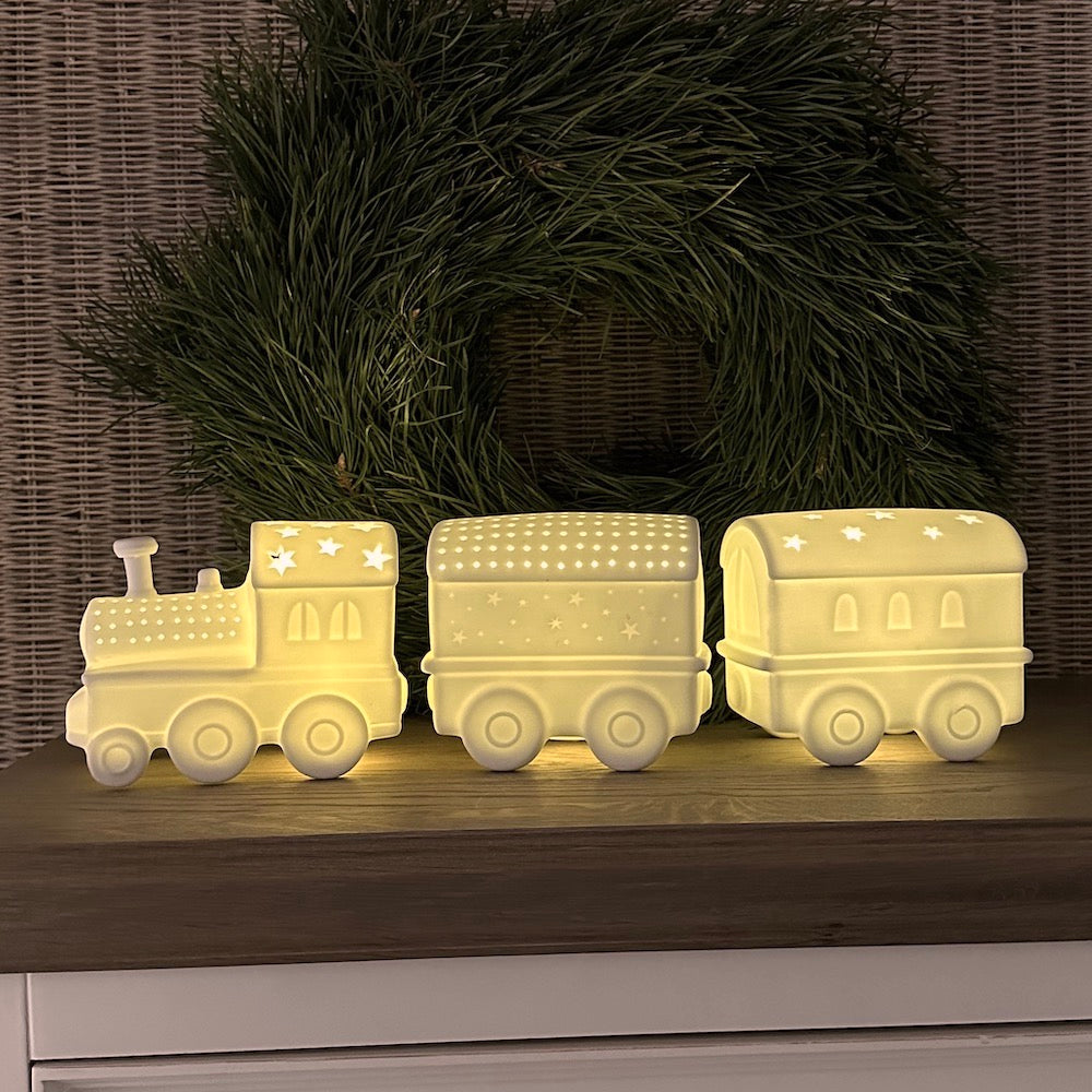 During the most enchanting season of the year, the LED light train from Räder creates a stunning visual experience. This charming winter train is crafted from porcelain and features a locomotive pulling two separate cars. With these three elements being distinct, you have the flexibility to arrange them as you wish, such as placing the car with the dotted roof or the one with star cutouts at the back. Especially on a table, sideboard, or shelf, Räder's train sets a magical Christmas ambiance.