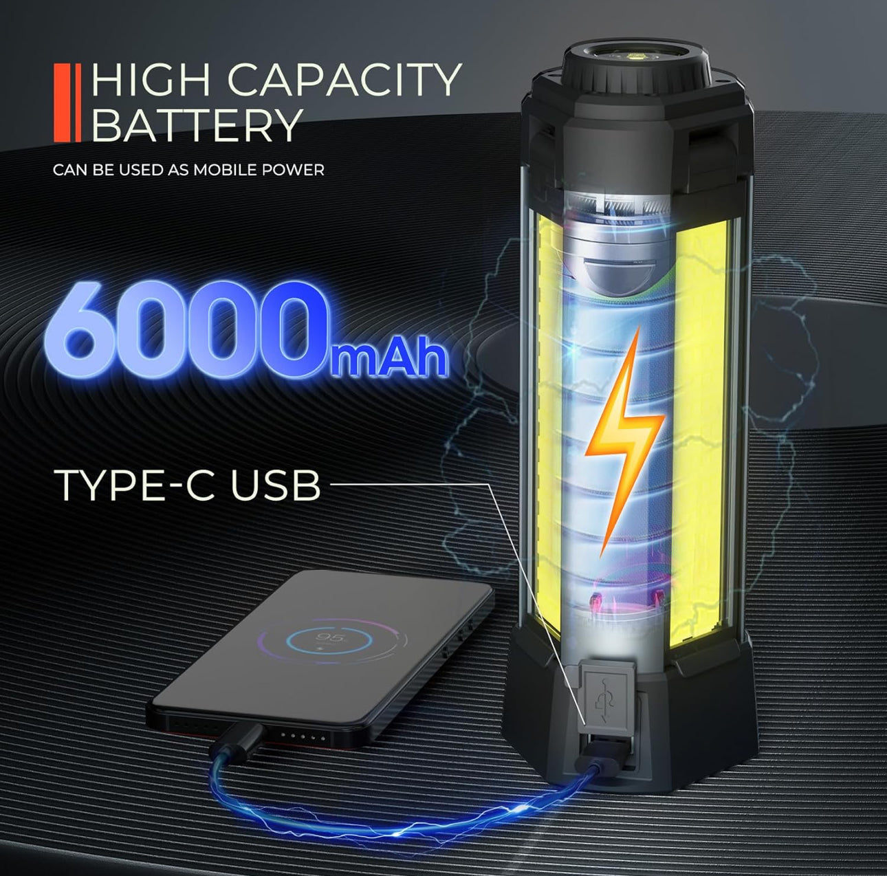 - 【BATTERY INDICATOR DESIGN】Unlike traditional LED work lights with stands, we have optimized the battery indicator so you can monitor the remaining battery level at any time, and it can also charge your phone in emergencies. The powerful 6000 mAh battery significantly extends the working time of the work light; even with strong light on, the camping lamp can be used for up to 5 hours or longer.