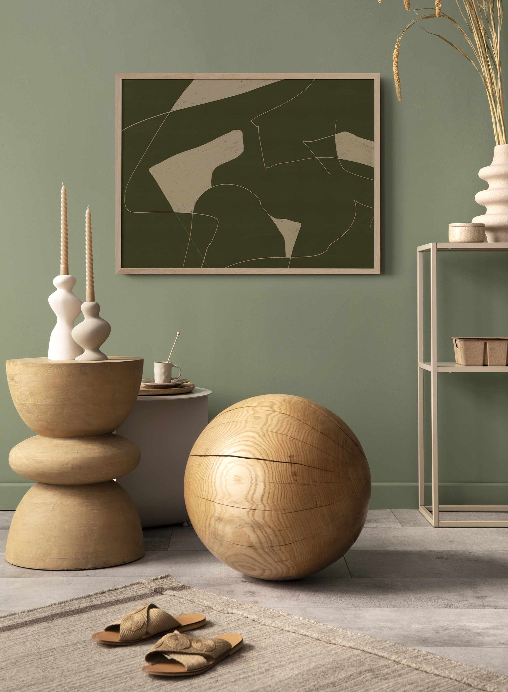 Experience how nature comes alive in abstract art! The 'Detour' poster features a stylish design with rich greens framed by white borders on a light beige background. The horizontal format of this contemporary art print is the perfect addition to your living room or bedroom.