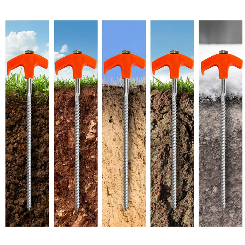 - ⛺【HIGH QUALITY AND DURABILITY】These stakes are made of sturdy steel and feature a threaded end for effortless usage and excellent grip when anchoring into various hard surfaces. Whether it’s grass, hard ground, gravel, or anything in between, they provide a secure hold.