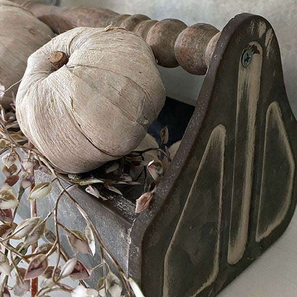 Our stunning metal caddy featuring a rustic patina and a wooden handle is crafted from galvanized metal and boasts a beautifully carved wooden handle!