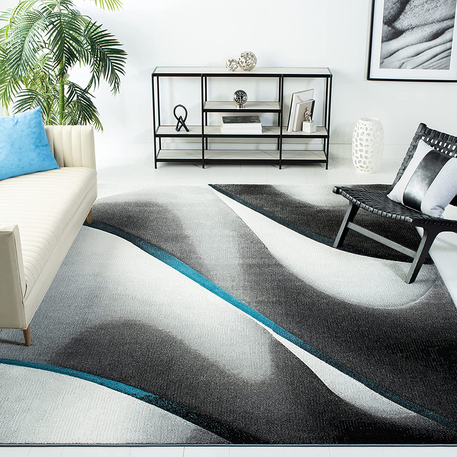 - One (1) Safavieh Hollywood Collection HLW712F Mid-Century Modern Non-Shedding Stain-Resistant Living Room and Bedroom Area Rug, 4' x 4' Square, Gray / Blue