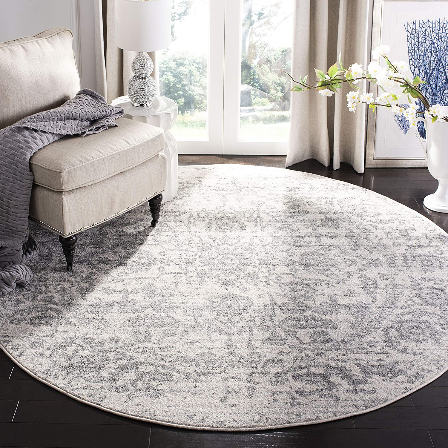 - One (1) Safavieh Madison Collection MAD603G Oriental Snowflake Medallion Distressed Non-Shedding Stain-Resistant Living Room Bedroom Area Rug, 3' x 3' Round, Silver / Ivory