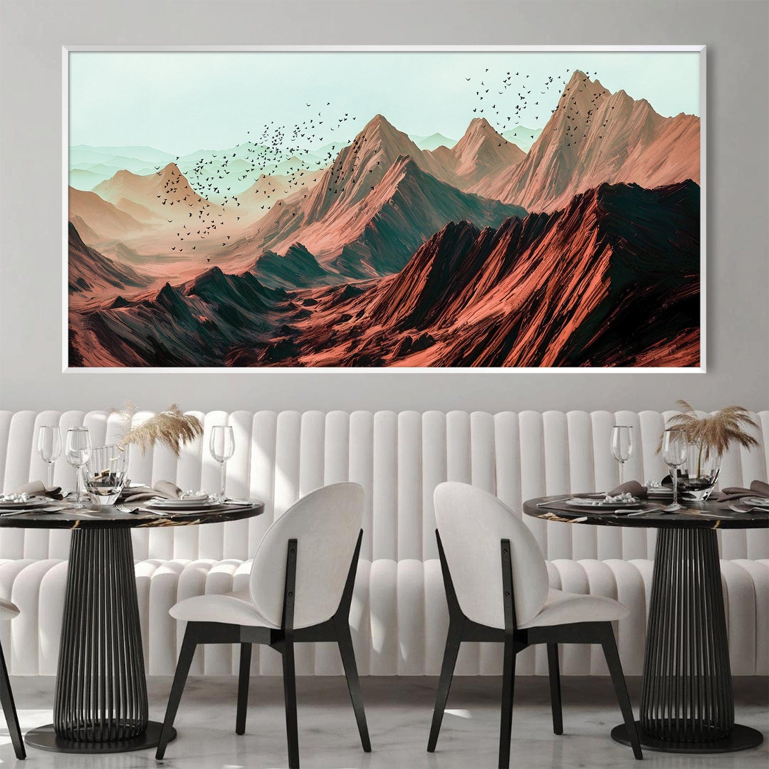Embark on a visual adventure with "Serenity Ridge," a stunning canvas print that captures majestic mountains and graceful flocks of birds. Crafted with loving brushstrokes and intricate textures, this artistic masterpiece presents a harmonious blend of browns, whites, and blacks. Enhance your space with the tranquility of nature, available as wall art, canvas prints, and framed wall art. Immerse yourself in the calm of remote peaks and the elegant flight of birds with this sophisticated artwork that brings the essence of nature into your living environment.
