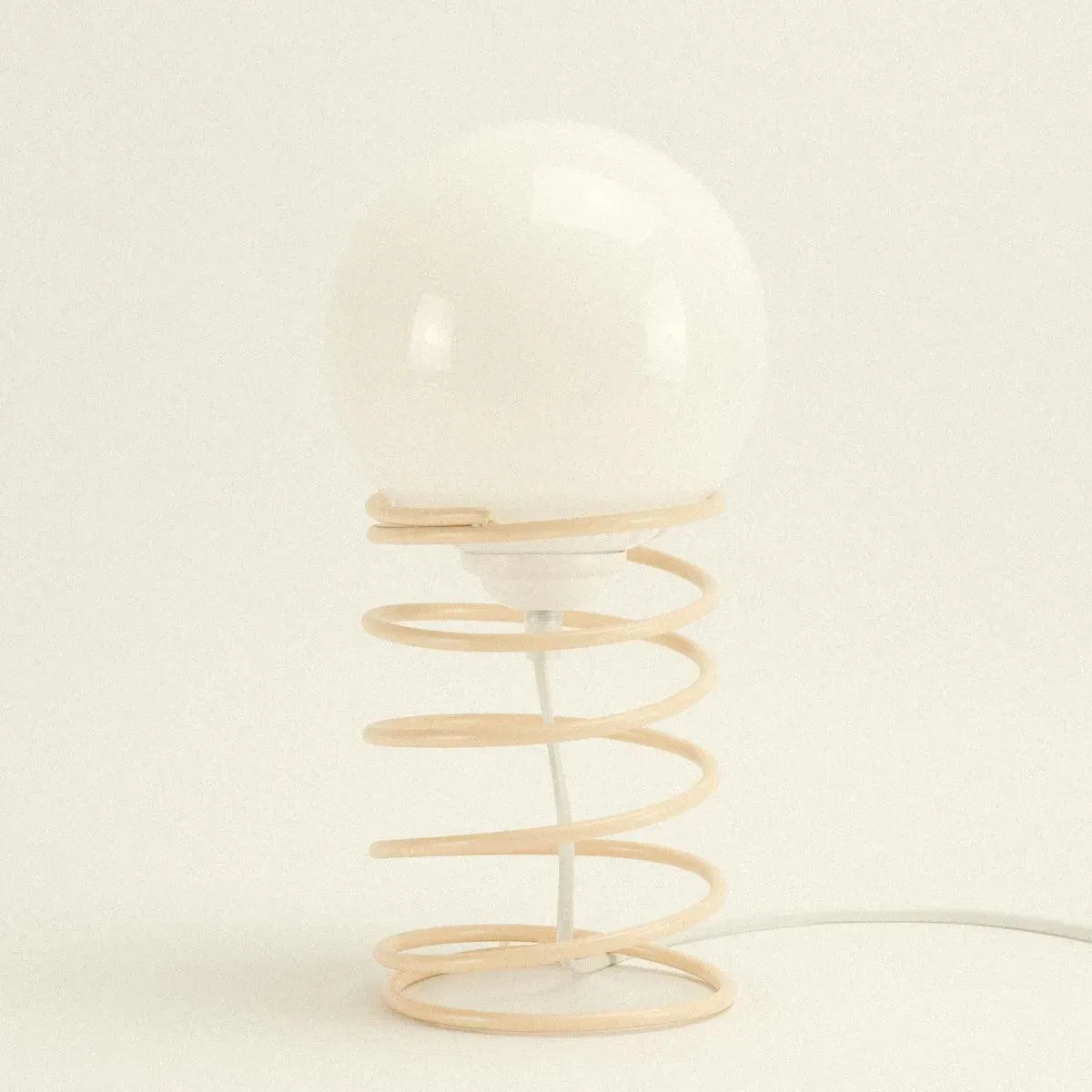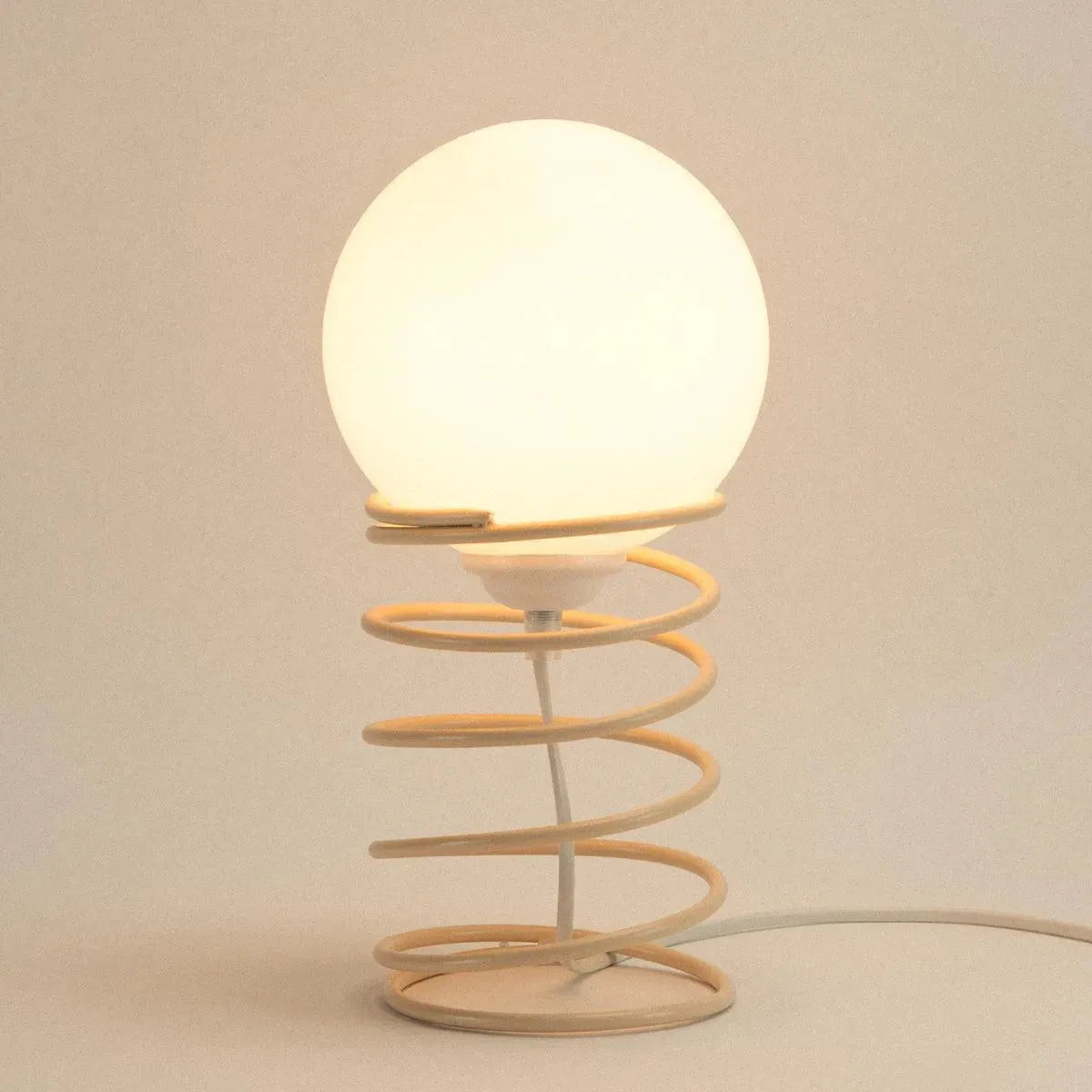 Infuse Your Space with Light features a stunning blend of frosted glass and sleek polished metal, thoughtfully crafted to provide a warm and welcoming illumination. The unique spring base paired with the frosted glass shade introduces a playful touch.